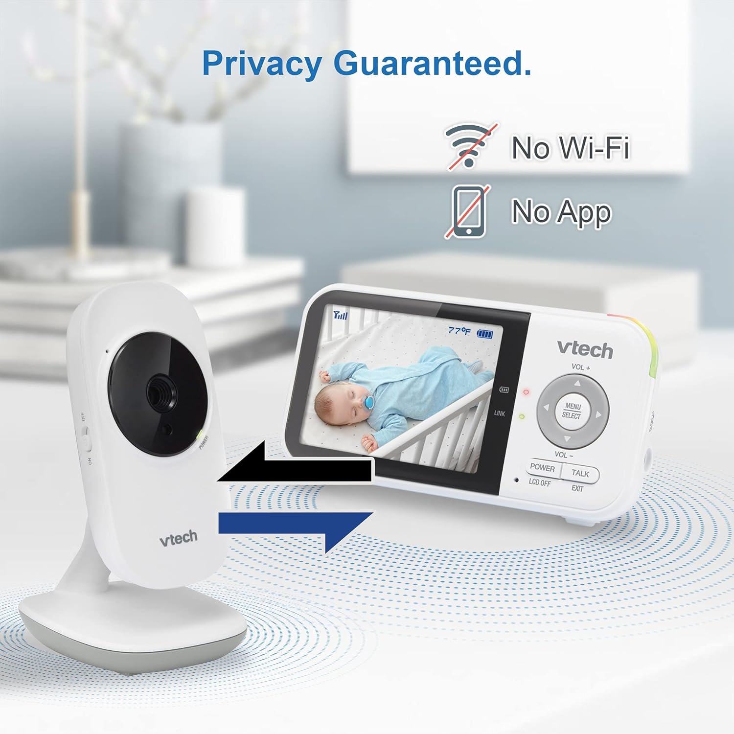💖 Privacy Guarranteed. No Wi-Fi or App Pairing – Trusted by US families for more than 3 decades, each VTech monitor is transmitted via secured internal 2.4GHz channel with FHSS technology, so you can rest assured that you’re the only one who can hear and see your baby. Parent Unit -4.92 x 2.87 x 1.30 inches. Baby Camera Unit -2.56 x 2.79 x 4.78 inches