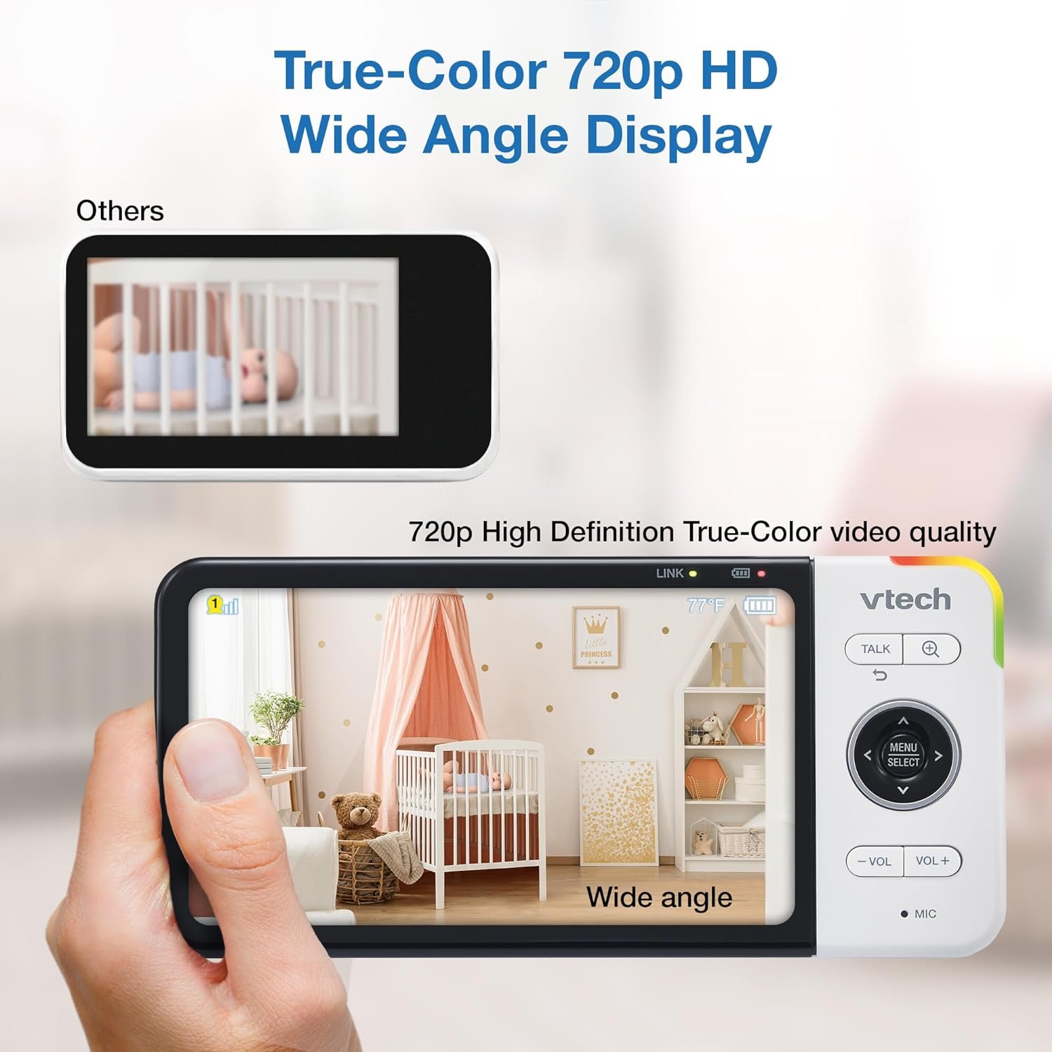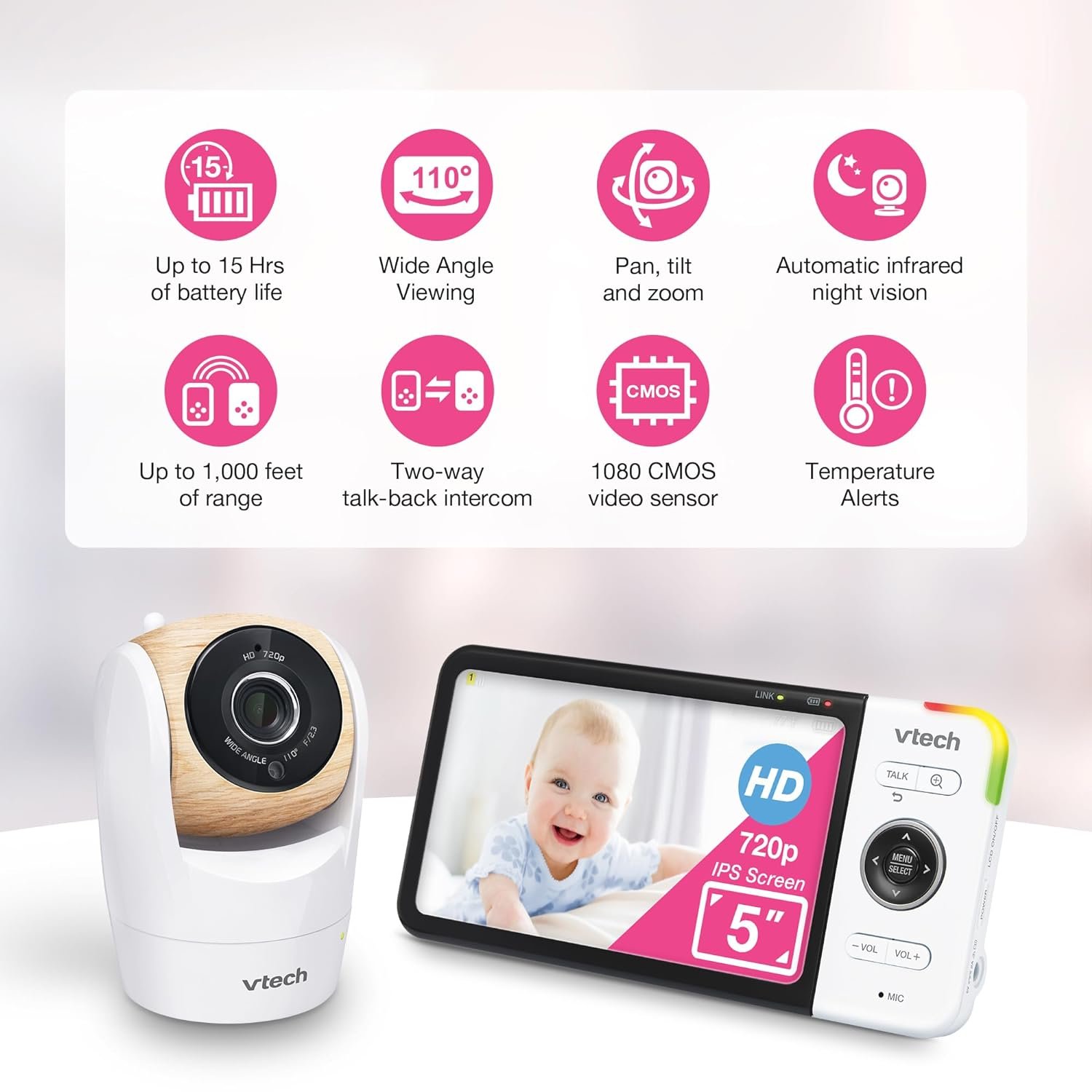 VTech VM928HD 5” 720p HD Display, Super 110 Wide Angle View Baby Monitor, Remote Pan-Tilt-Zoom,Night Vision, Up to 1000ft Range, Temperature Sensor, 9 Soothing Sounds & Lullabies,2-way Talk, No WiFi