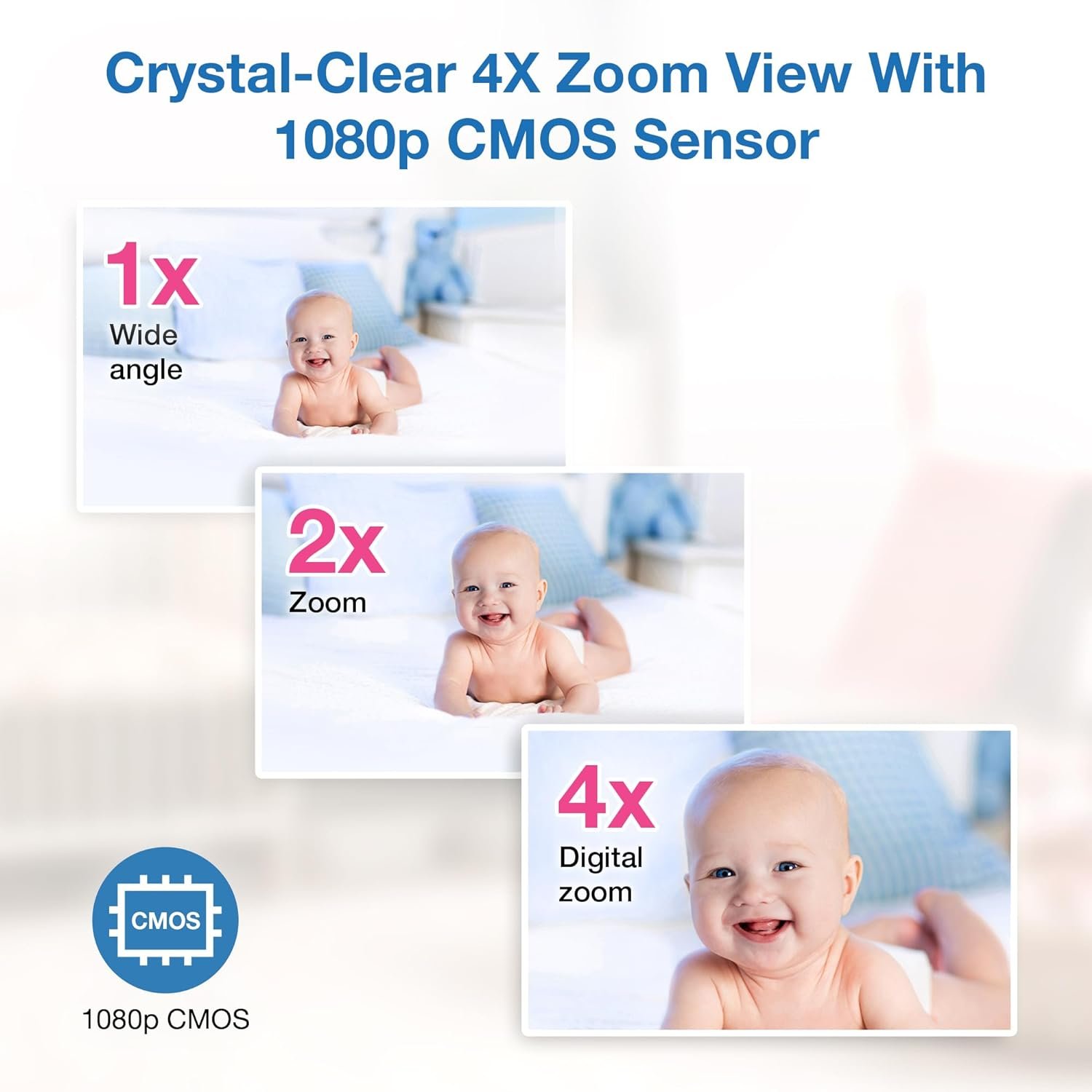 [Pan Tilt & Zoom with 4x Zoom] Fully remote Pan & Tilt achieved 360-degree panoramic viewing, with camera pans up to 270-degree side to side, tilts 100-degree up & down; The camera zooms up to 4 times using the parent unit; Use a damp cloth for cleaning