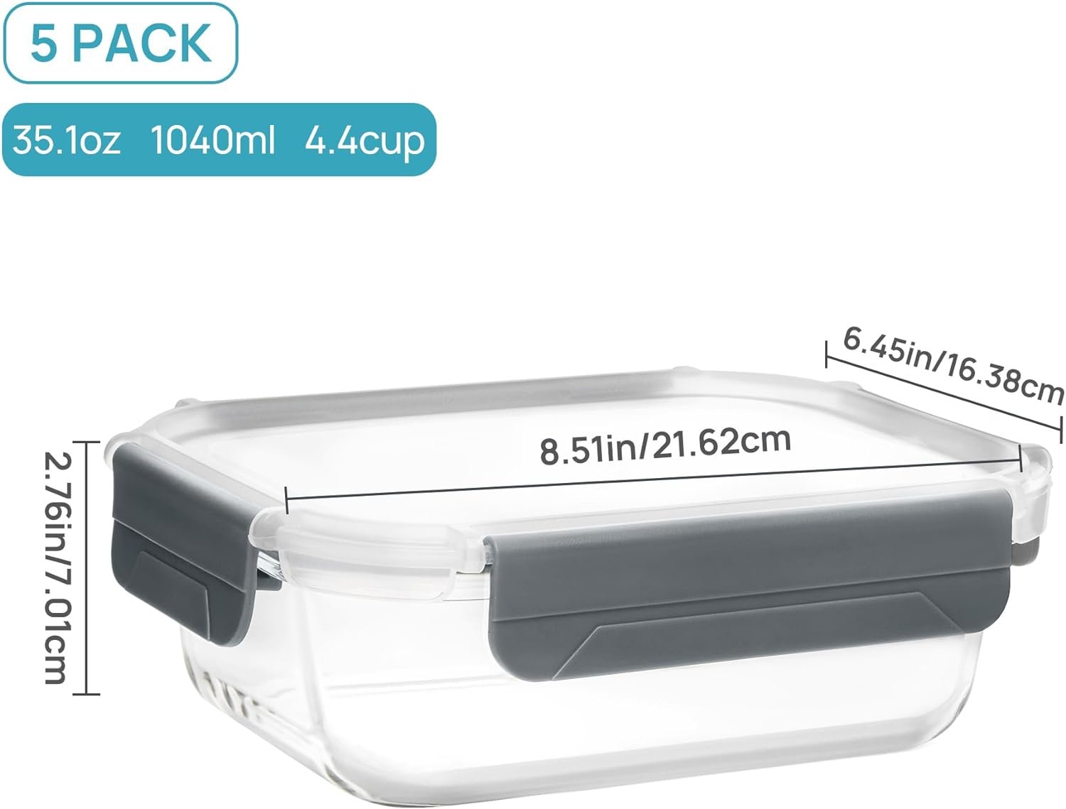 5PACK GLASS STORAGE CONTAINERS WITH LIDS–5 glass food storage containers with 5 lids. The large capacity 35oz food storage containers for meal prep, office lunches, leftovers, portion control, fulfill all your storage needs. Perfect for bringing to the gym, picnics, barbecue and more.