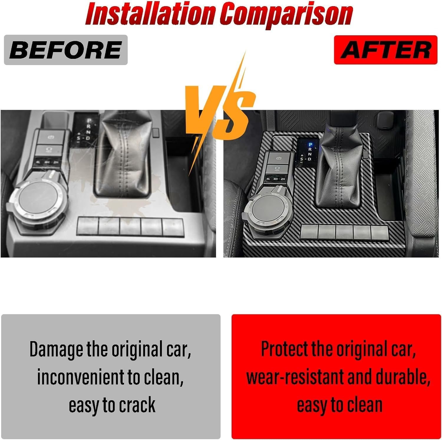 Easy Installation: The center console gear shift panel protection cover comes with double-sided tape on the back for easy installation. Simply peel off the red tape and adhere it firmly in place—it’s secure and won’t easily come off.