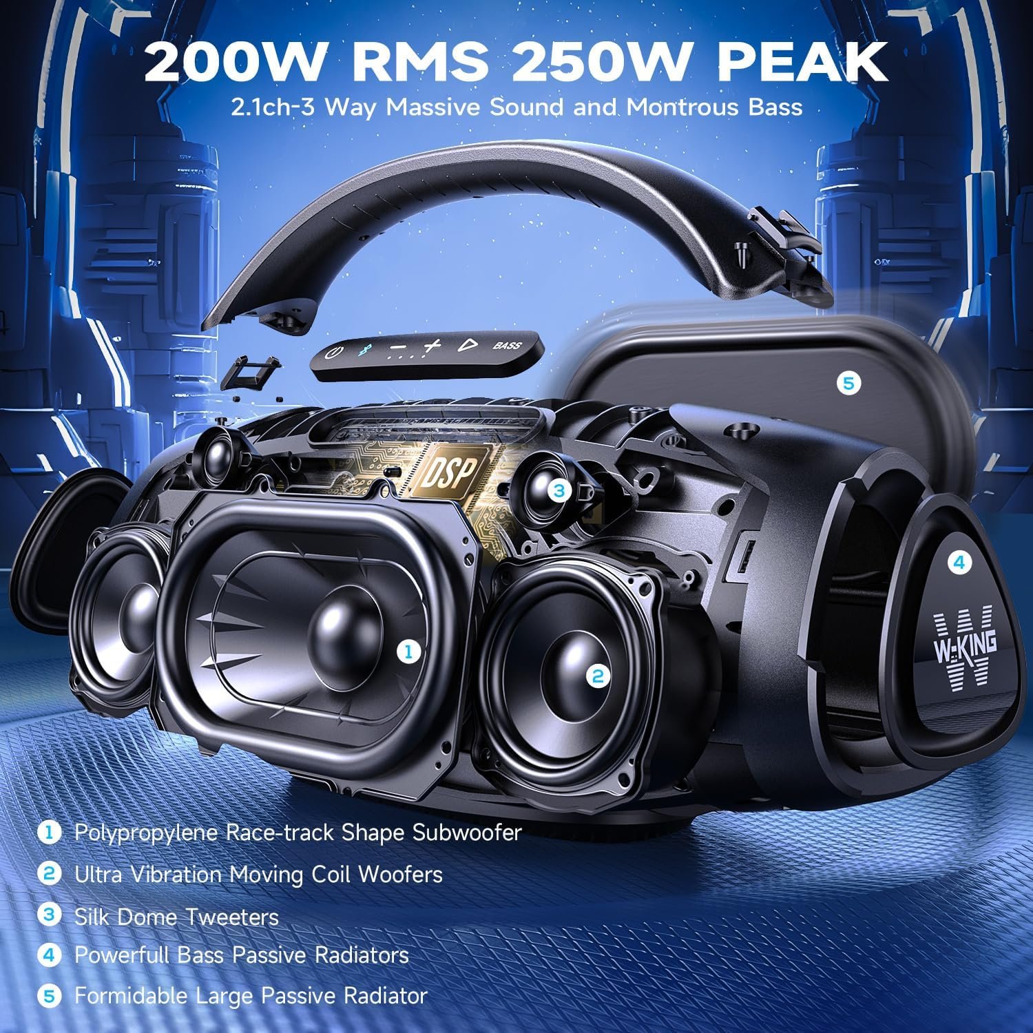 300W Peak 200W RMS Deepest Dynamic Bass: The massive 250W peak allows the bluetooth speaker to deliver extreme dynamic and powerful bass and treble, providing an immersive listening experience. A robust 200W RMS ensuring high-quality massive sound reproduction over extended periods without distortion. Whether for professional music studio, large party, home gathering, movies or games, the bluetooth speaker is desirable to you