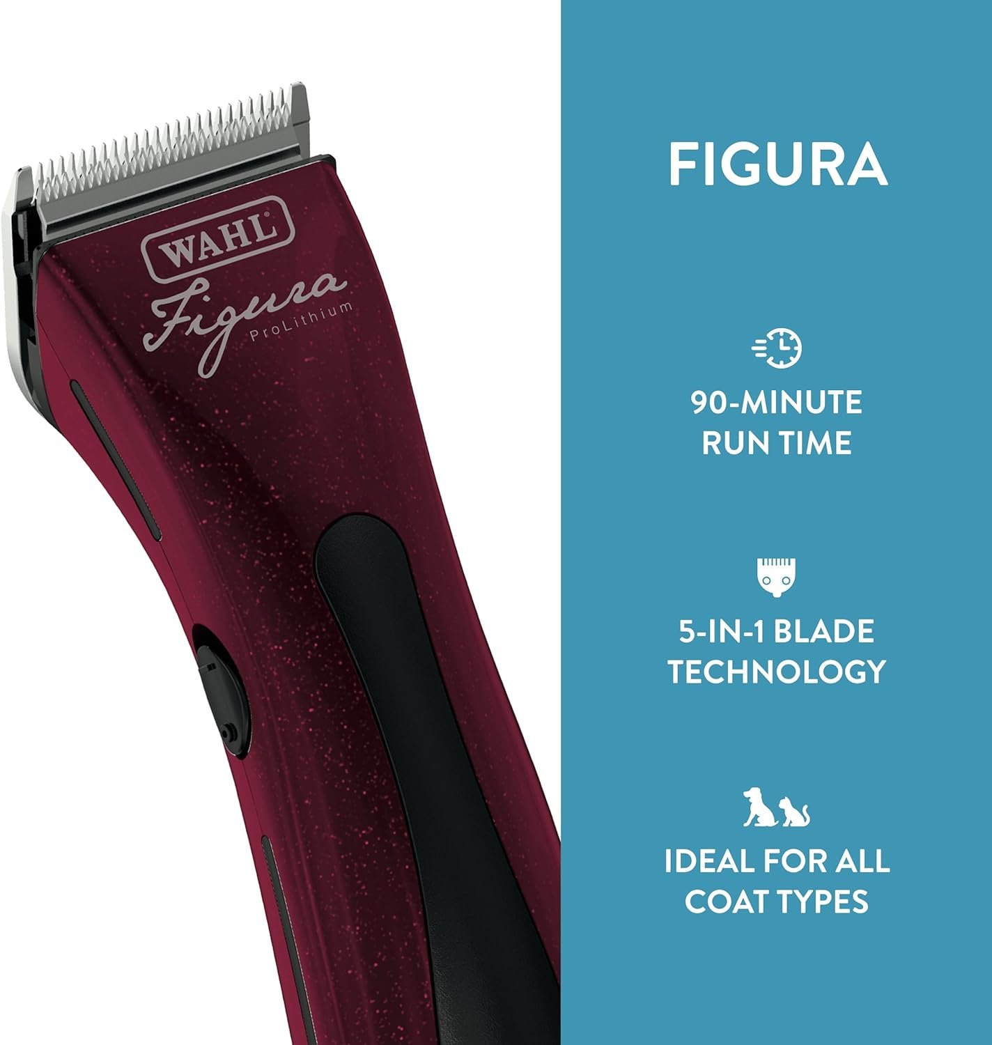 Includes the Figura Lithium Ion rechargeable clipper, 5-in-1 detachable blade set, charge stand, four attachment guide combs, 9-inch storage case, cleaning brush, blade oil, and instructions