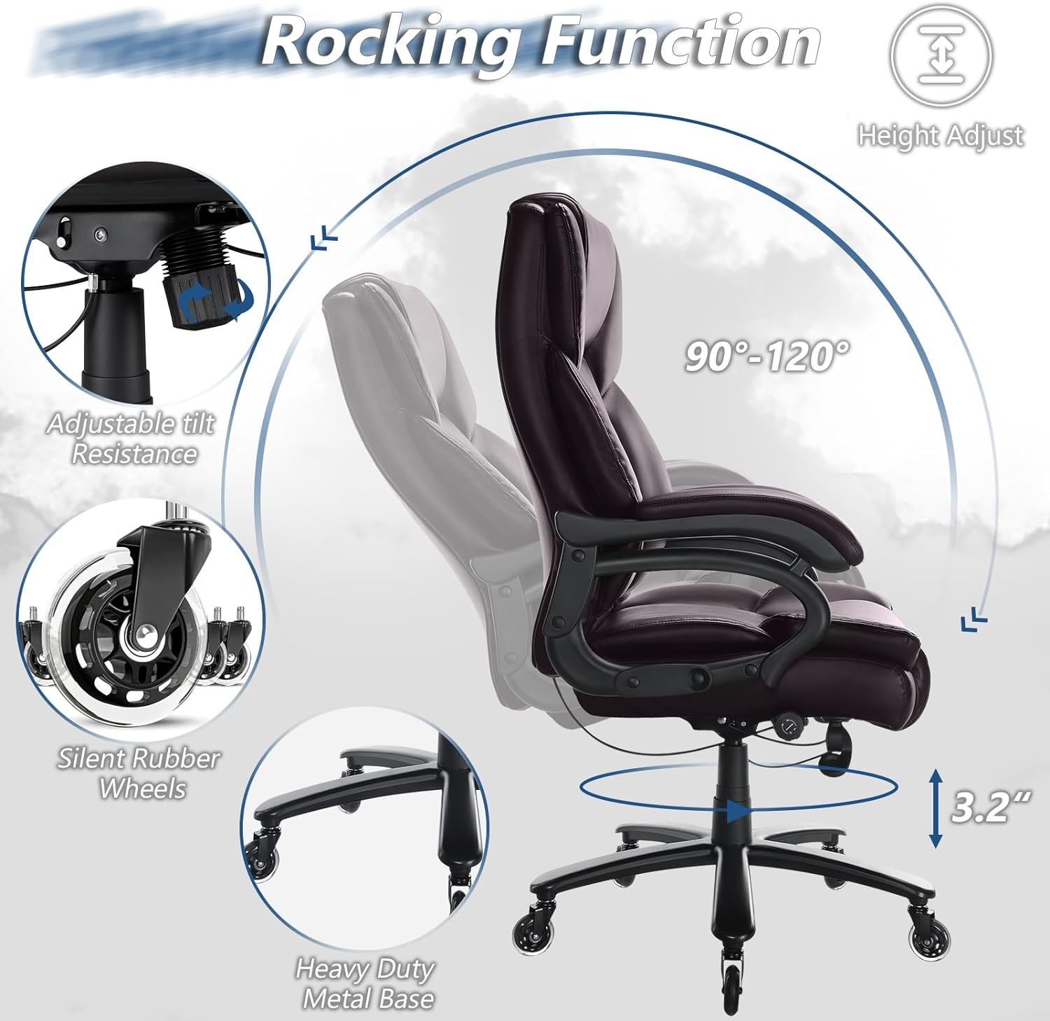 ✅【Multi-Functional Office Chair】With a 360°free swivel – 3.2” height adjustable system, the executive chair’s backrest angle can also be changed between 90°and 120°, and your preferred tilt resistance can be set by the knob at the bottom, perfectly suiting your demans for work and relaxation.