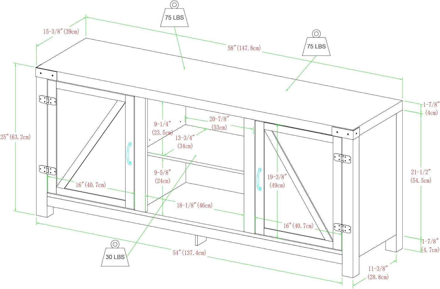 Include our TV stand in your living room to give the area a charming, country feel. Features concealed storage space behind the barn styled side doors with adjustable shelving to fit your media and accessories, while having a mix of rustic and modern farmhouse style. This entertainment center is made of durable, high-grade MDF and can support most TVs up to 65-inches. As a storage console, it will keep your living room looking neat while also giving it a homespun feel.