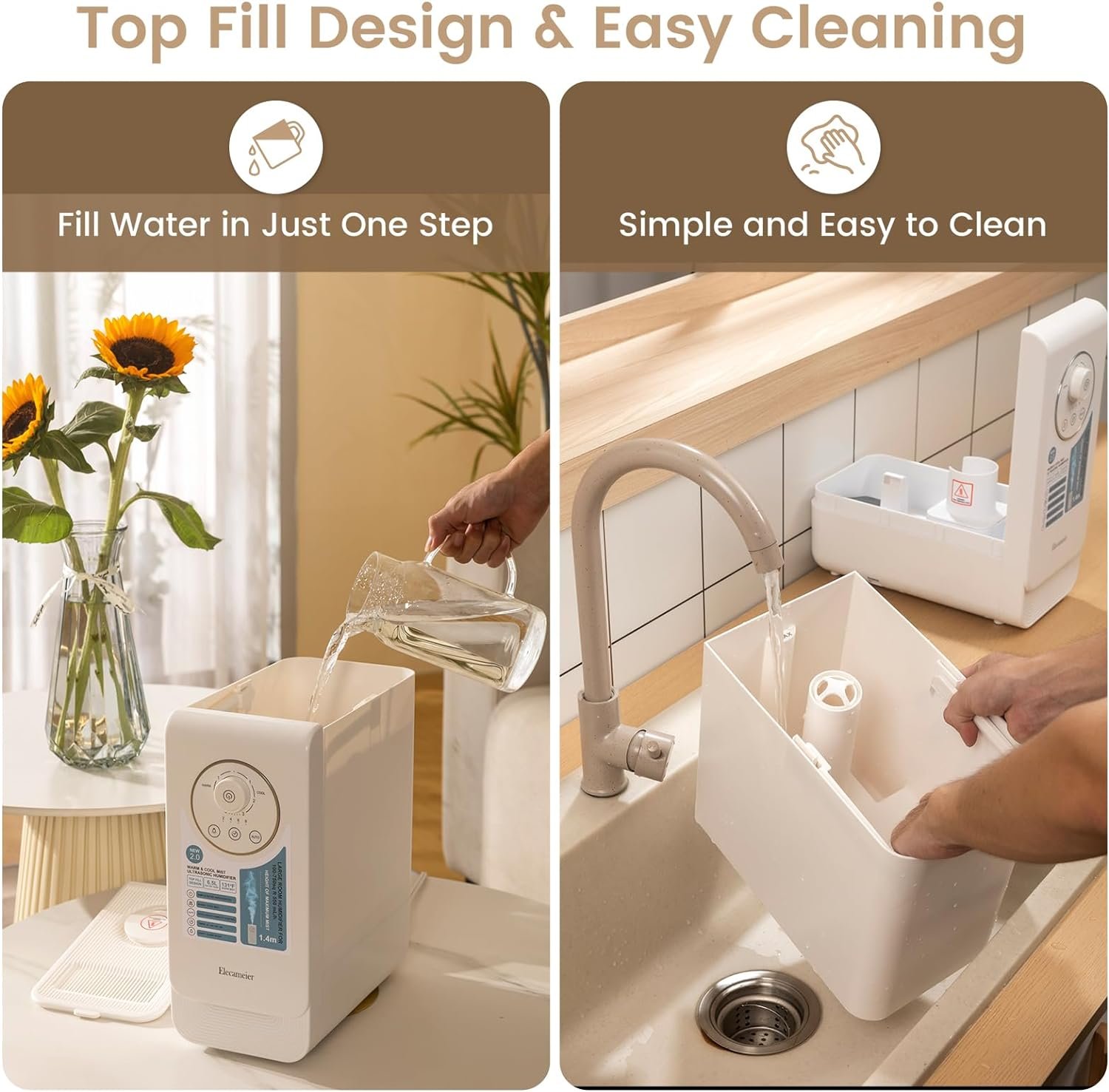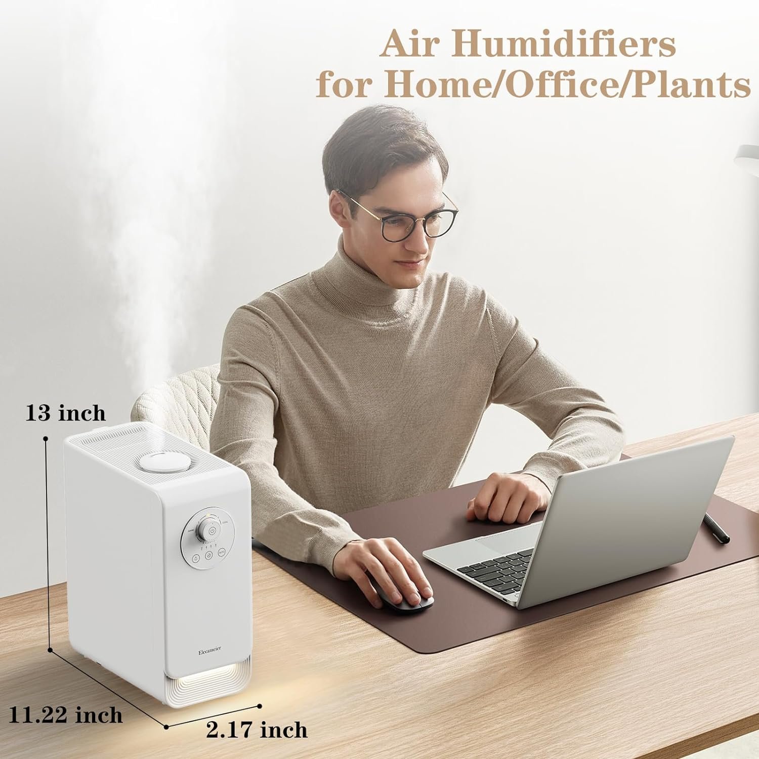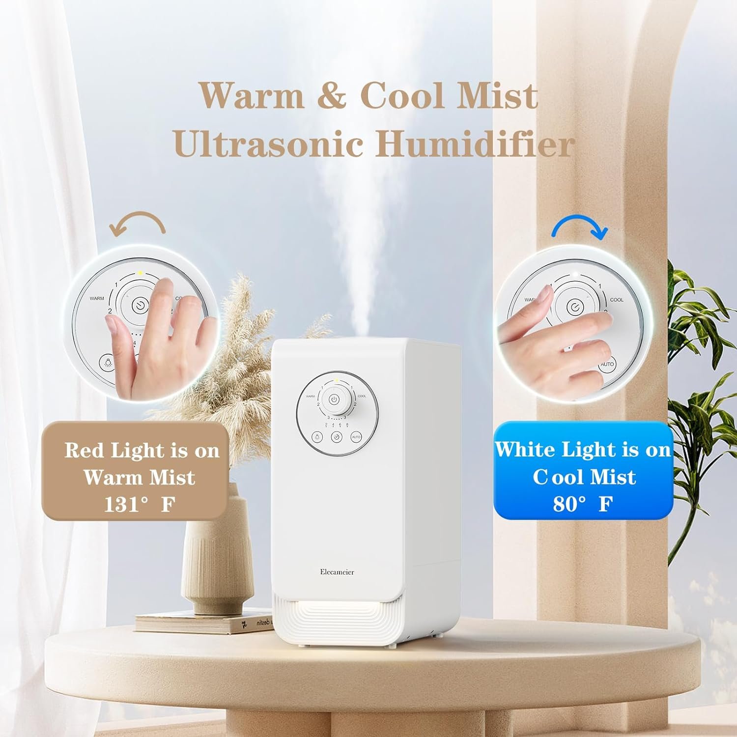 ELECAMEIER New 2.0 warm & cool mist humidifier, which has a large 6.5L water tank, can run continuously for 24 -48 hours when filled with water, the large mist output is suitable for a 500 sq ft large room. A simple knob switch makes it easy to operate and the detachable water tank allows for top filling, making cleaning a breeze. As a plant humidifier, bedroom humidifier, the unique design ensures that it doesn’t take up too much space and can be placed in any corner of the room.