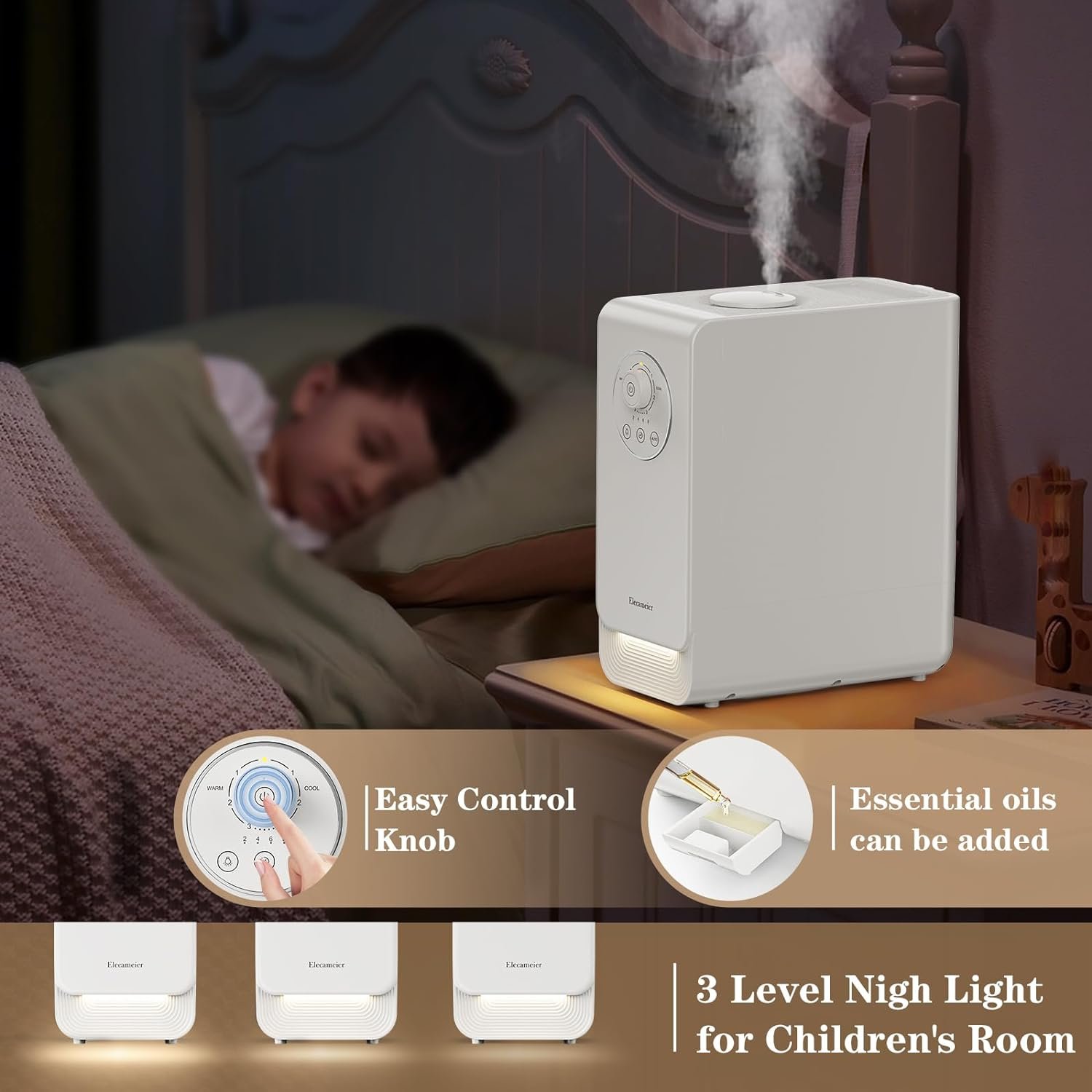 [Bedroom humidifier with LED Light & Auto Shut off]A simple rotary switch makes it easy to control the on/off switch of the machine and the night light, and you can also adjust the amount of fog as needed.1-24 hour timer design with automatic switch-off protection makes for a warm and cozy night.