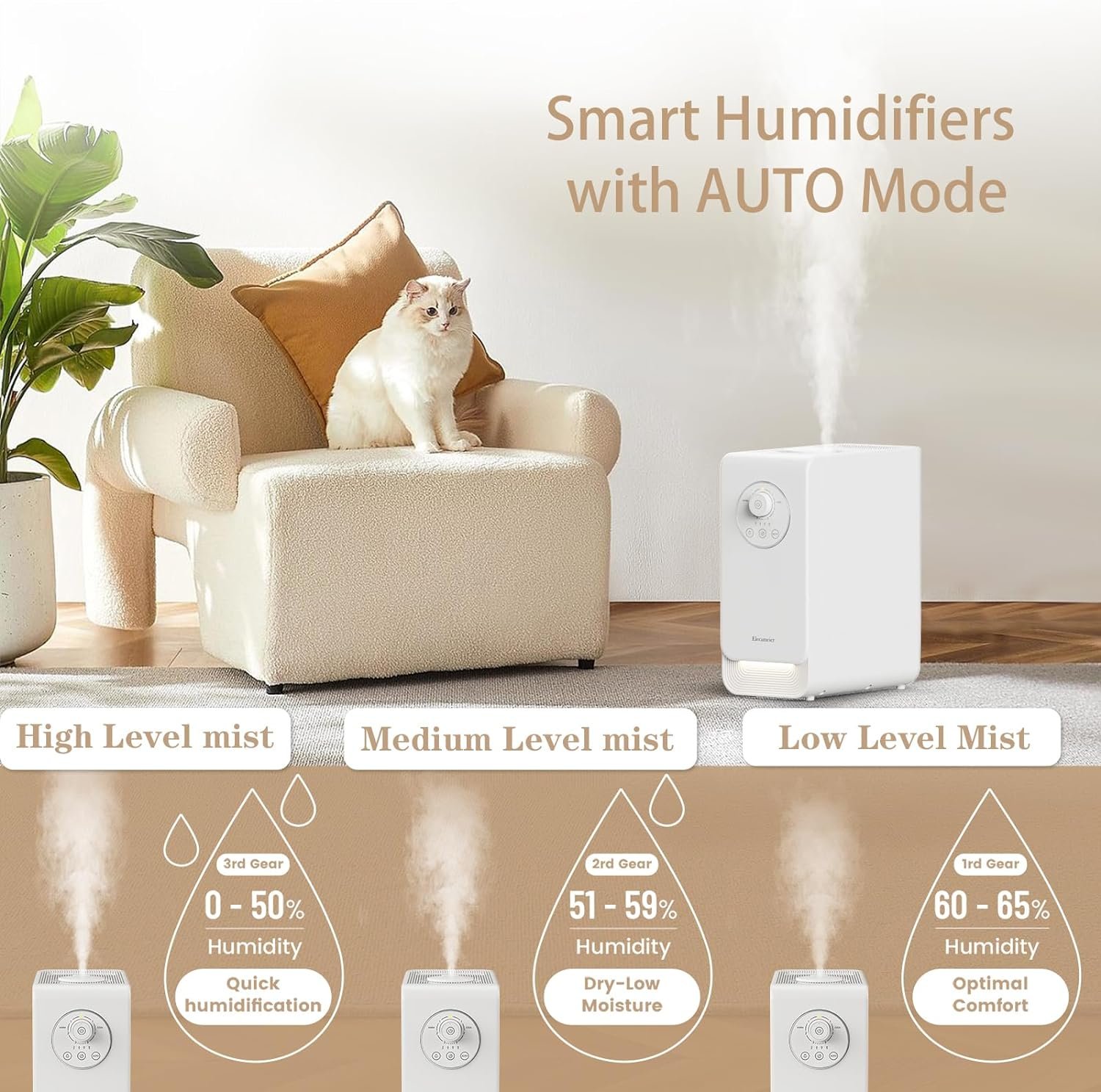 [Smart humidifiers with AUTO mode]AUTO mode senses the humidity in the room and automatically adjusts the level of mist output, keeping you in a comfortable environment at all times. Perfect humidifiers for plants indoor.