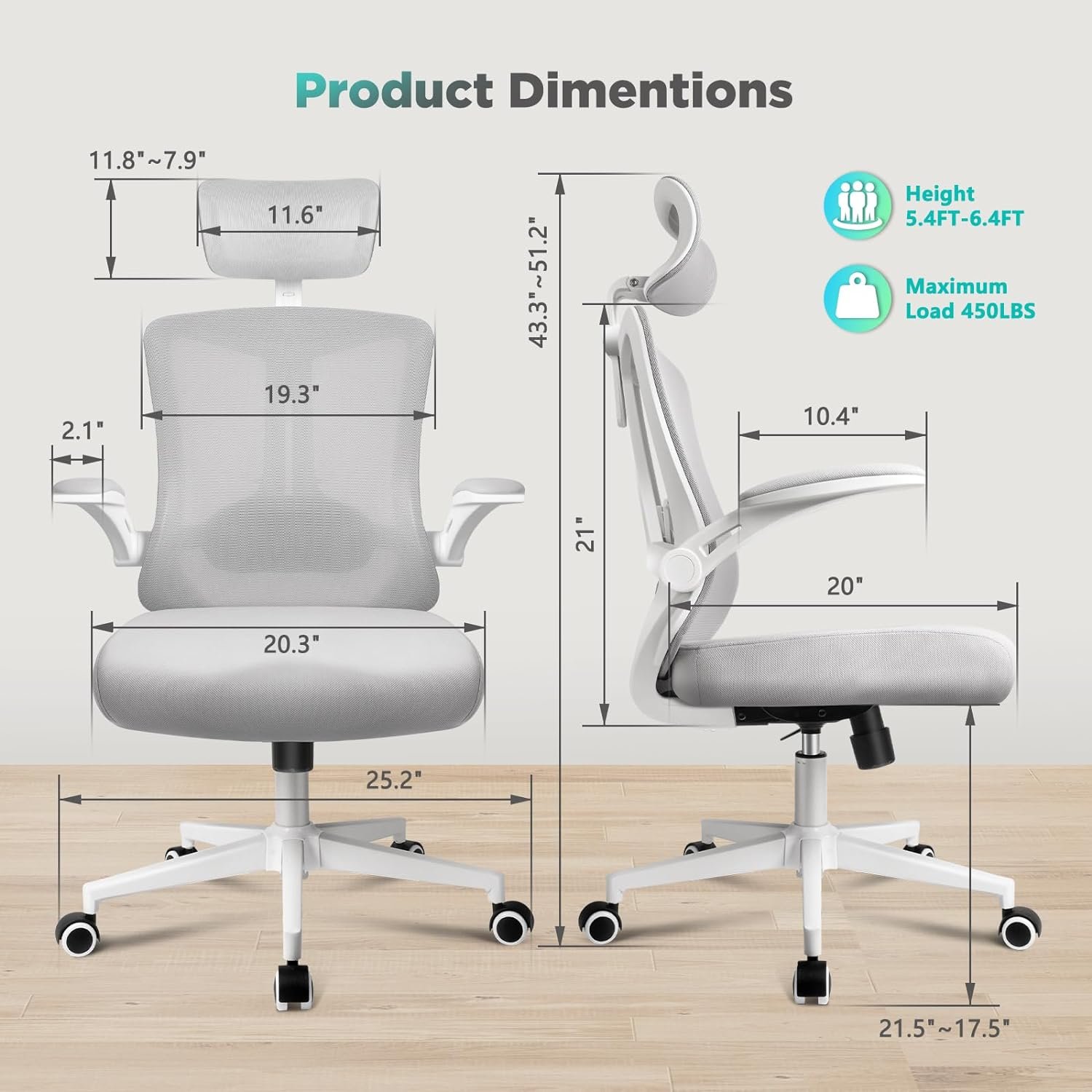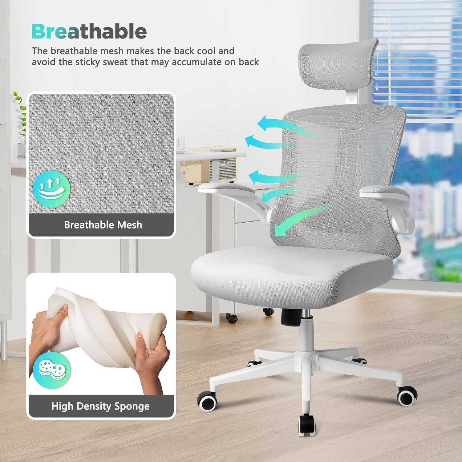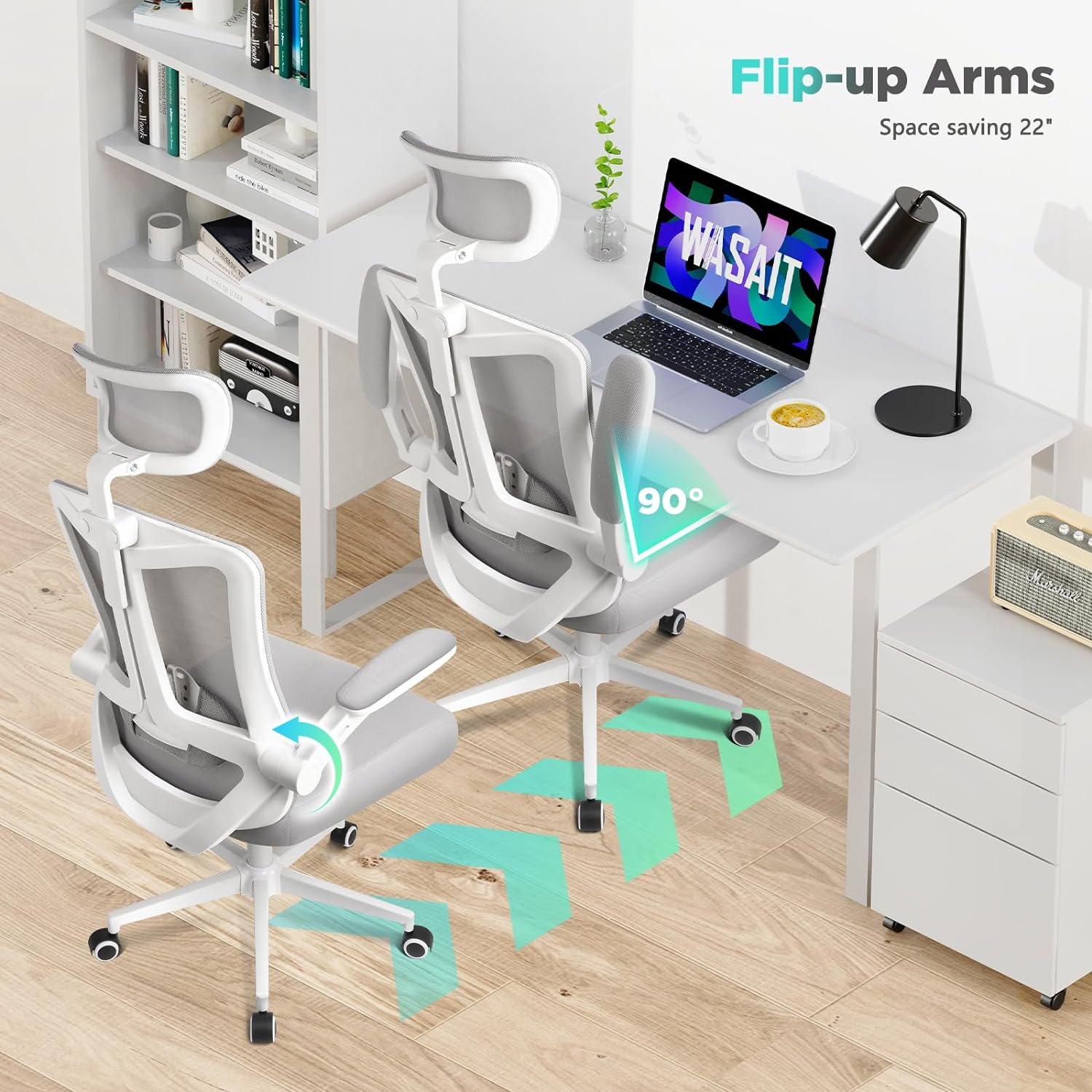 🏆【90° FLIPPED UP COMPUTER CHAIR ARMRESTS】 You can adjust it to a horizontal position for elbow support or fold it up to 90° vertically, providing you with more mobility space & storage magic, convenient for those who need to move frequently. It also allows the arm chair to be pushed under a desk or stored in a smaller room, saving space. 360° swivel base+mute chair wheels smoothly in any direction with minimal noise, enhance convenience for those working at l-shaped desks or co-working islands.