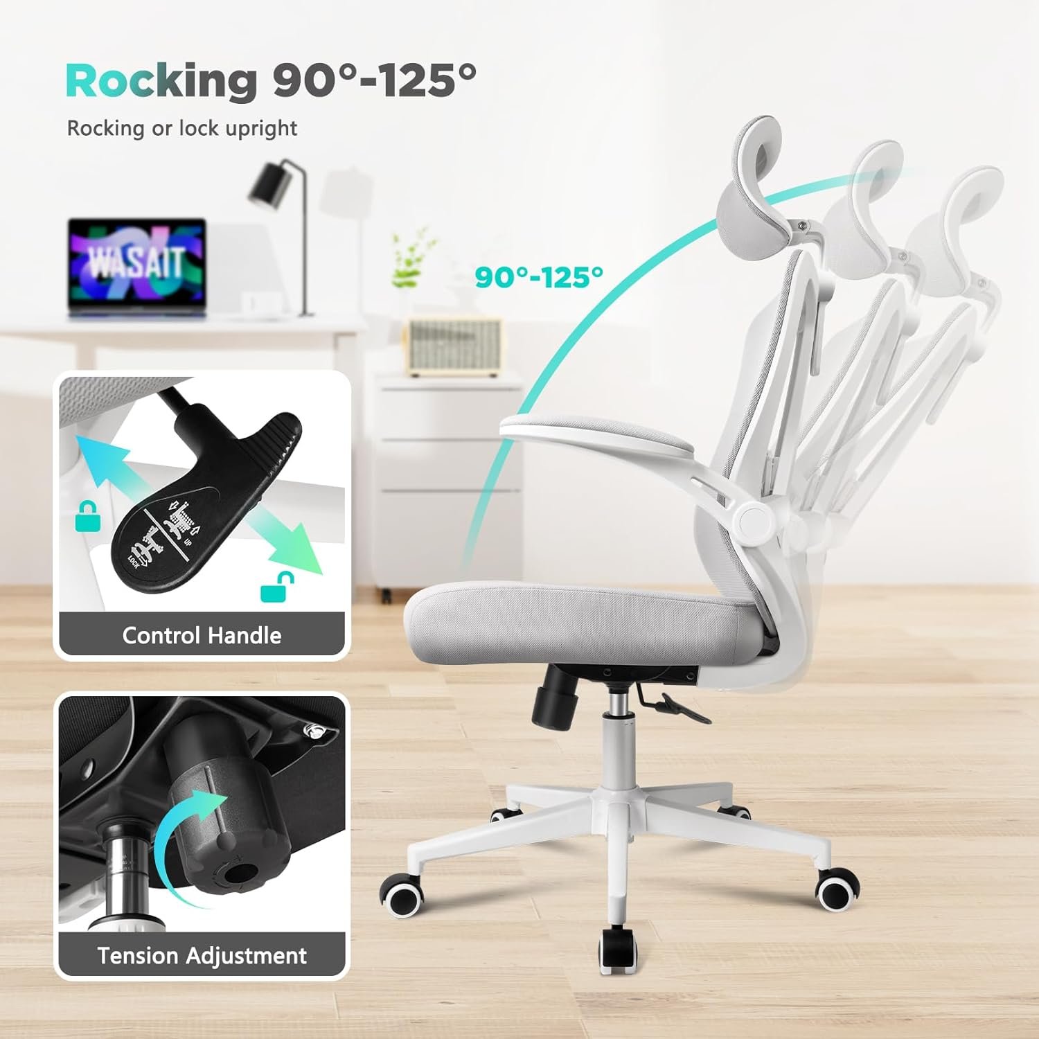 🏆【Rocking Function + Lock Upright】By adjusting the control handle, You can instantly enjoy the relaxing rocking feature or the stable lock mode, all depending on your mood. The white home chair is only lockable in the upright position & doesn’t offer locking in other positions. Pulling the handle allows the rocking chair to swing while pushing it in locks the ergonomic office chair in an upright position (CANNOT be locked in a tilted one). This home office desk chair can be tilted by 90°~125°.