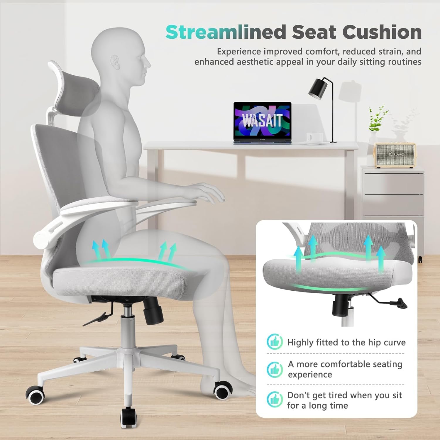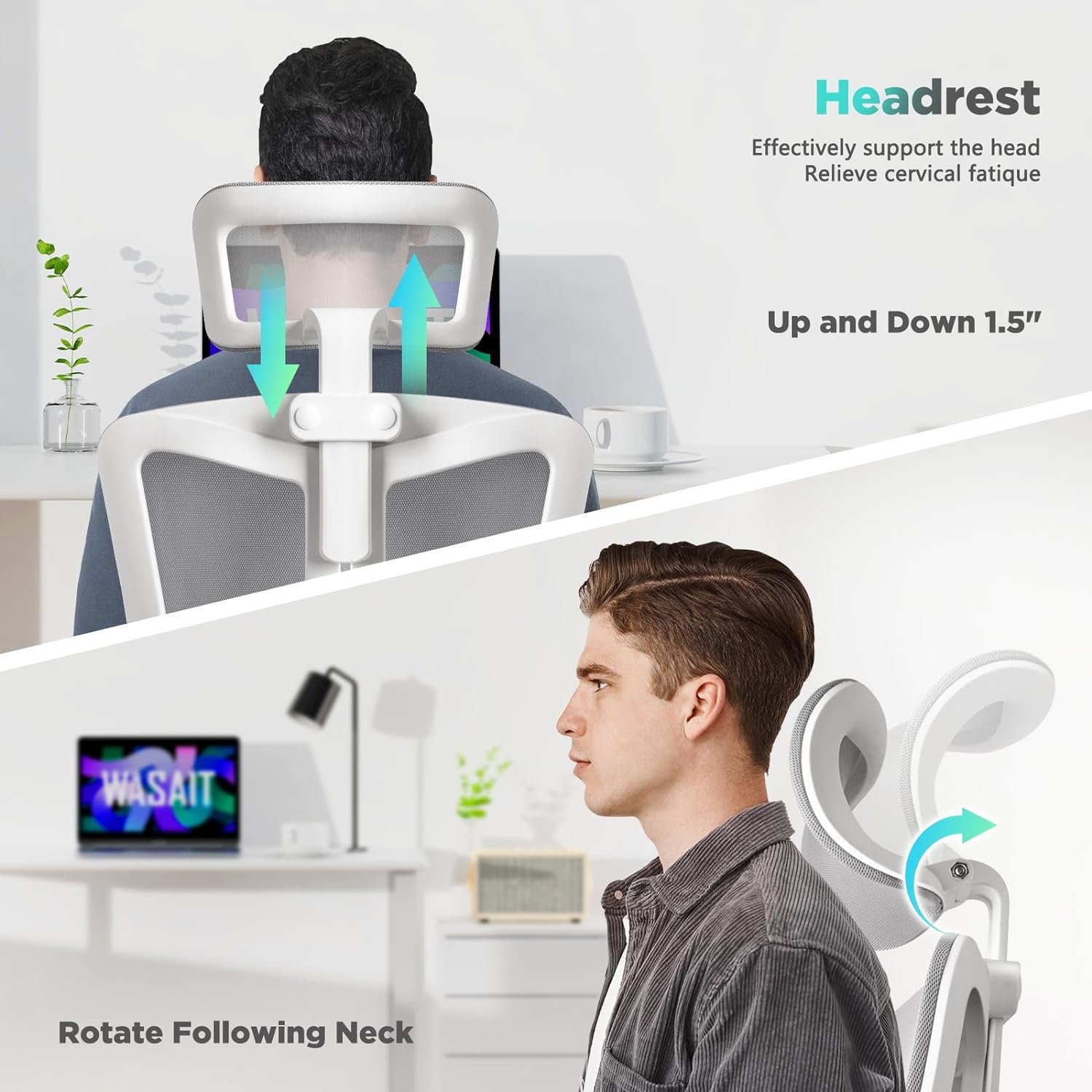 🏆【2D ADJUSTABLE & DETACHABLE HEADREST】 Wasait home office chair comes with a 1.5 inch up & down adjustable headrest. It automatically rotates 45° based on your neck movements, providing comprehensive support for your head, helping alleviate neck fatigue or pain caused by prolonged sitting. The Wasait ergonomic desk chair serves as an office chair, desk chair, study chair, home chair, white gaming chair & computer chair. Widely applicable in offices, homes, meeting rooms, studies, & assemblies.