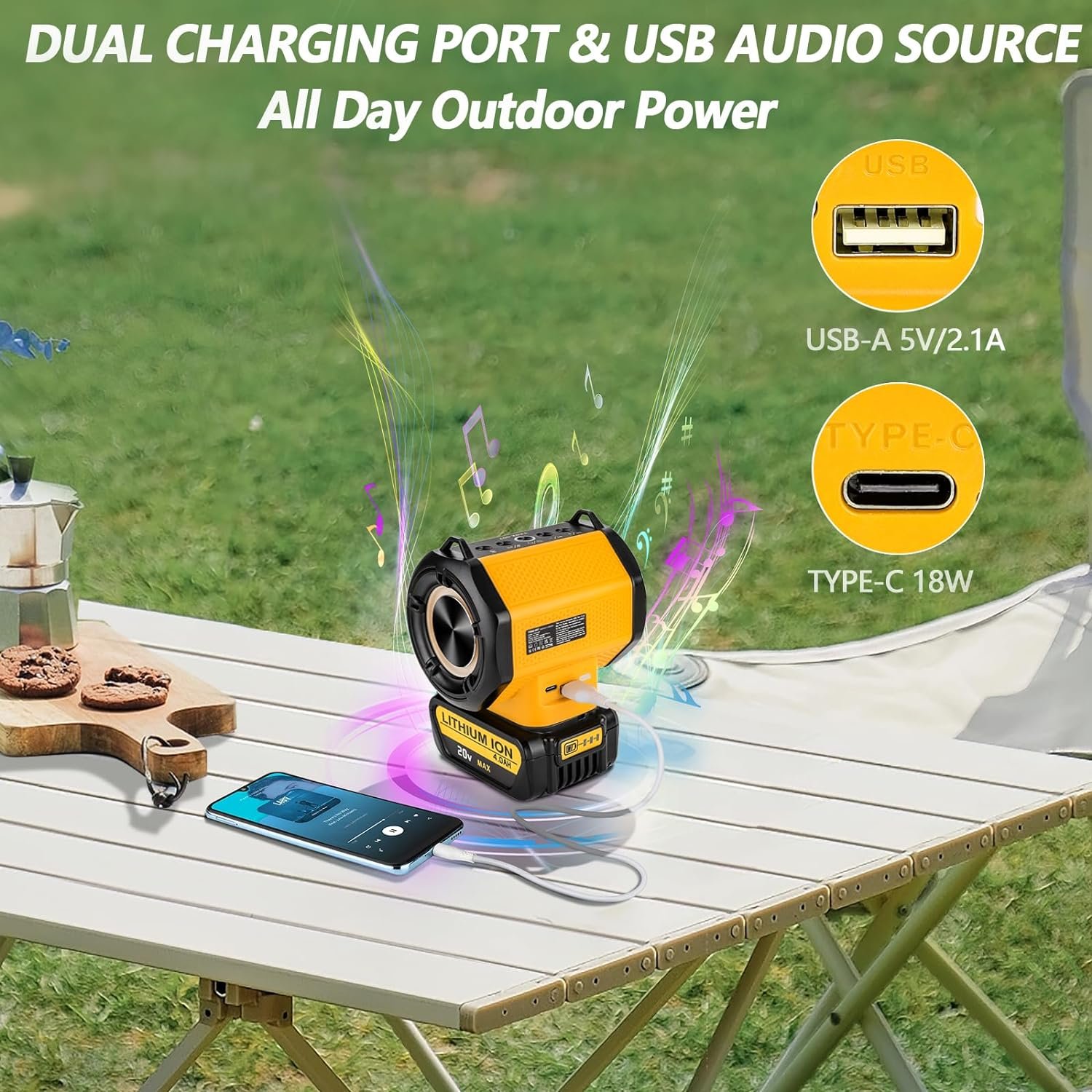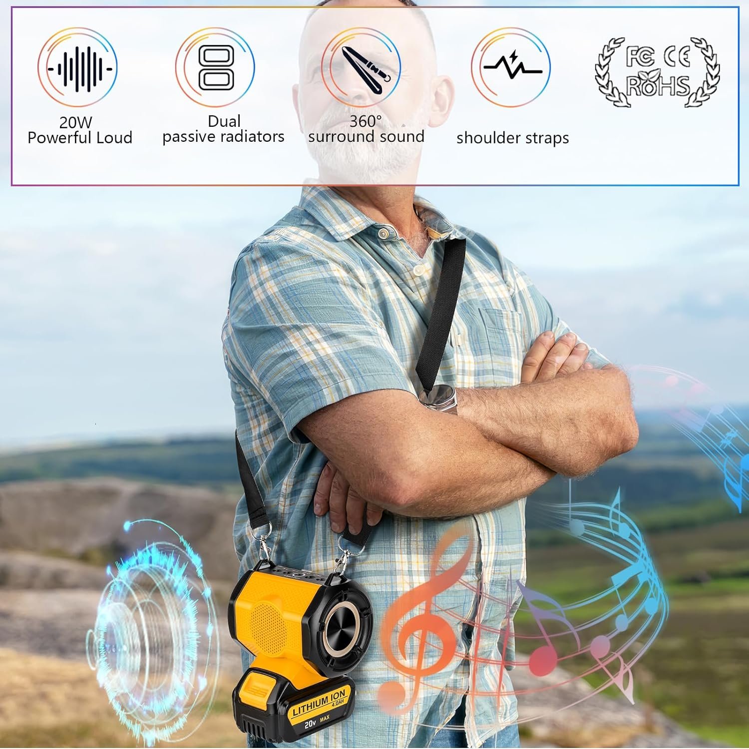 【20W SUPERIOR SOUNDS POWERED BY DEWALT 20V BATTERY】1 full-range drivers and 2 Bass diaphragm produce 20W loud stereo sound with enhanced bass, detailed mids, and crystal clear highs without distortion at any volume. Perfectly compatible with dewalt 20v lithium battery.
