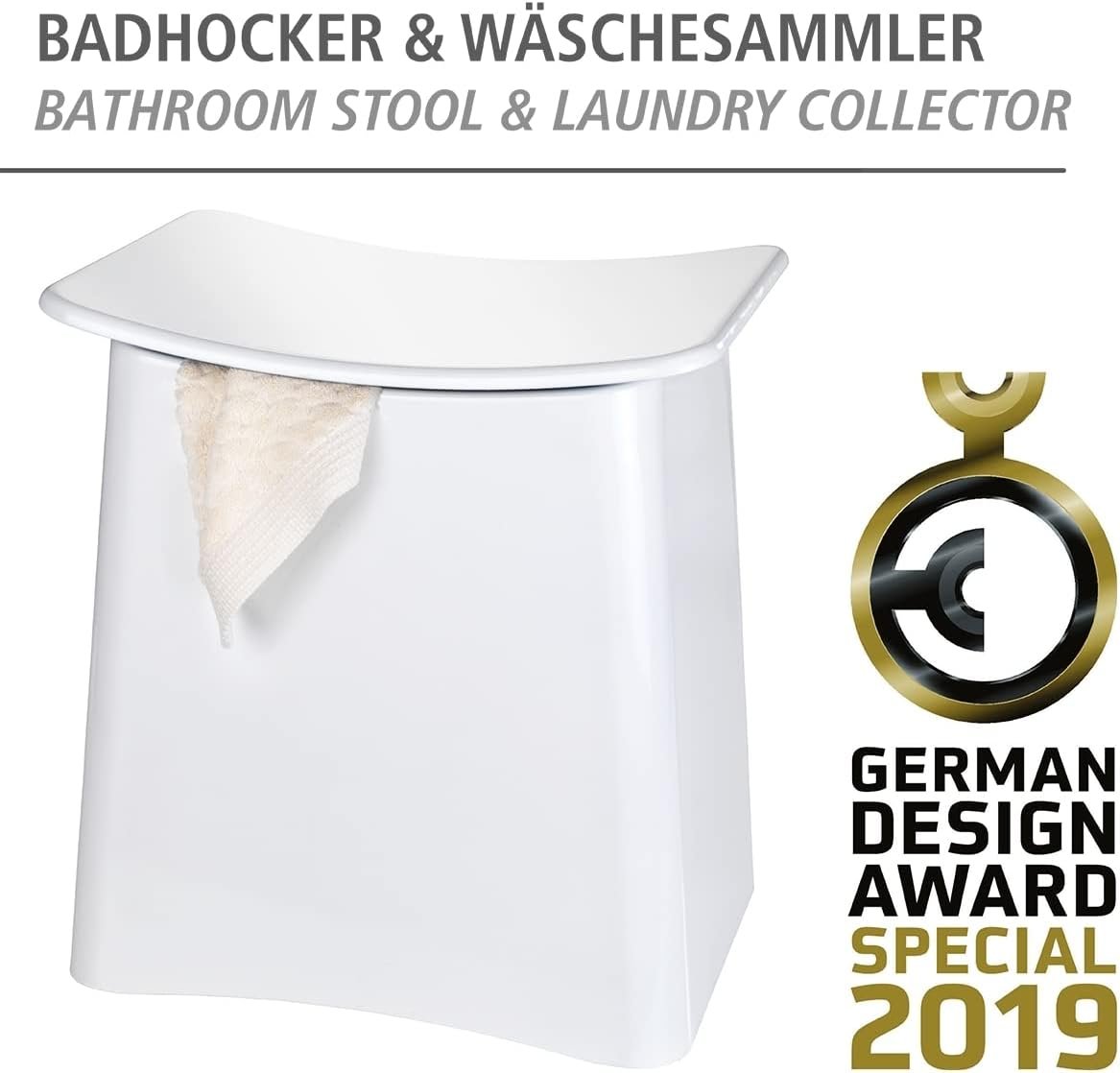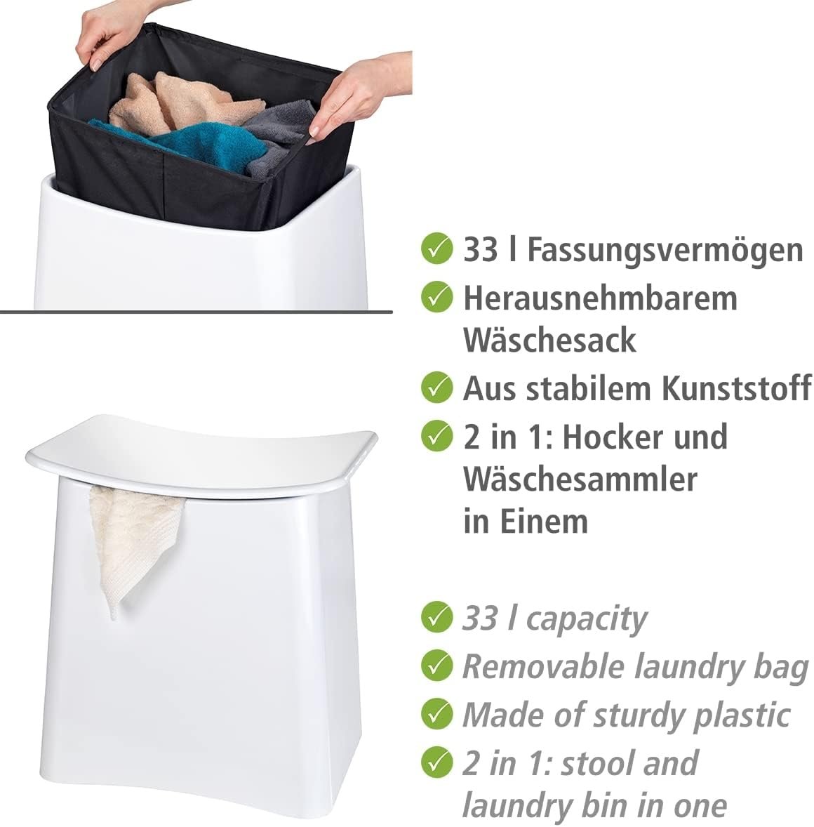 The practical bathroom laundry basket stool offers a large storage space under the seat surface for dirty laundry. The removable laundry bag offers 33 liters storage space for laundry waiting for the next wash. Its generous seat surface is a permanent invitation to sit in comfort.