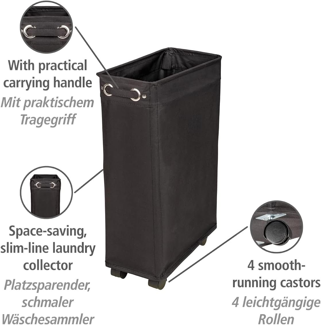 The space-saving, narrow laundry basket is made of high-quality polyester and can be easily moved thanks to its four wheels. Thanks to the privacy cover, unsightly dirty laundry can be successfully hidden. This means that niches and corners can now become practical storage space. The Corno laundry basket in seductive black has a capacity of 43 litres. Its LAUNDRY lettering makes the laundry basket a real eye-catcher.