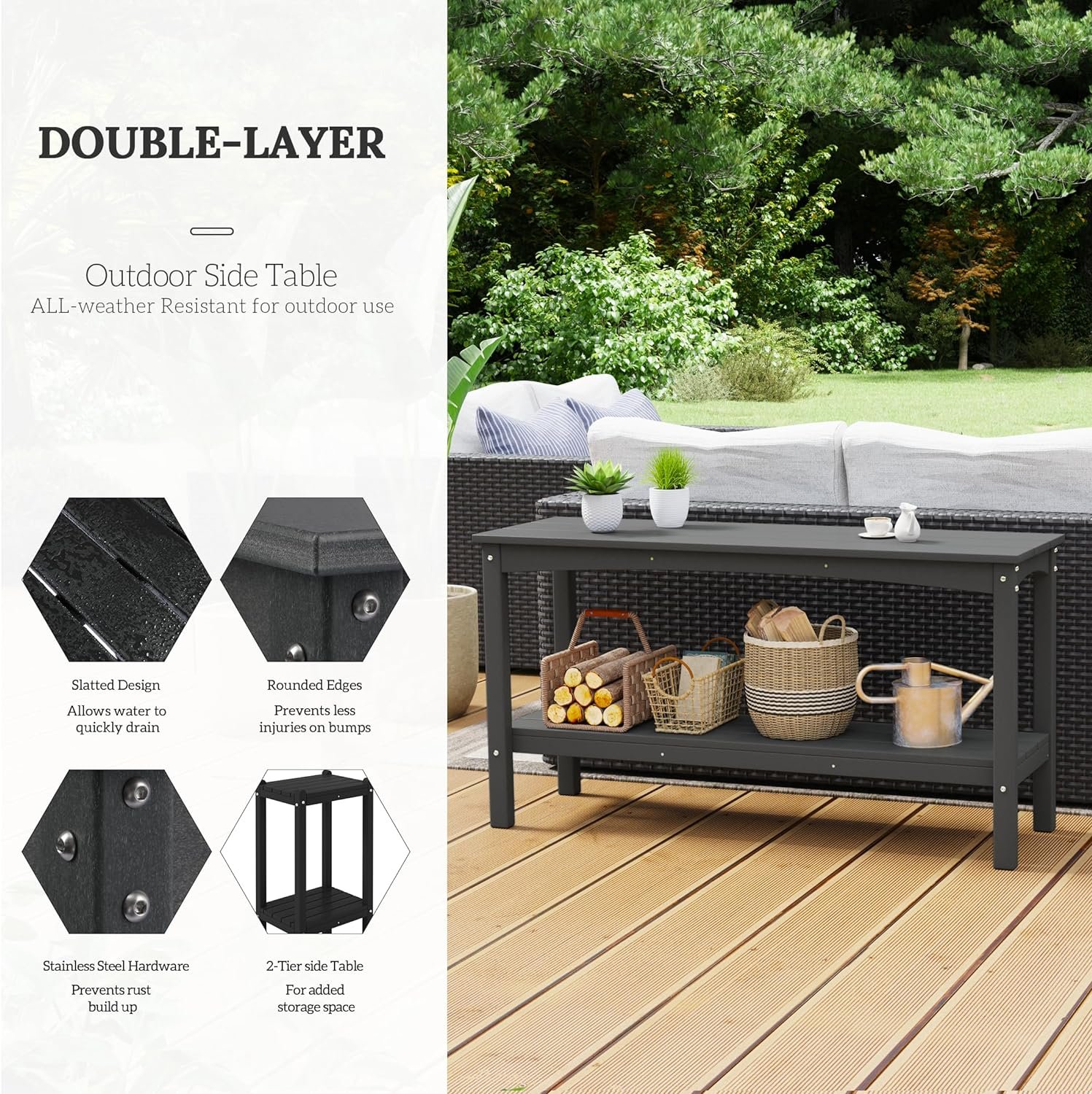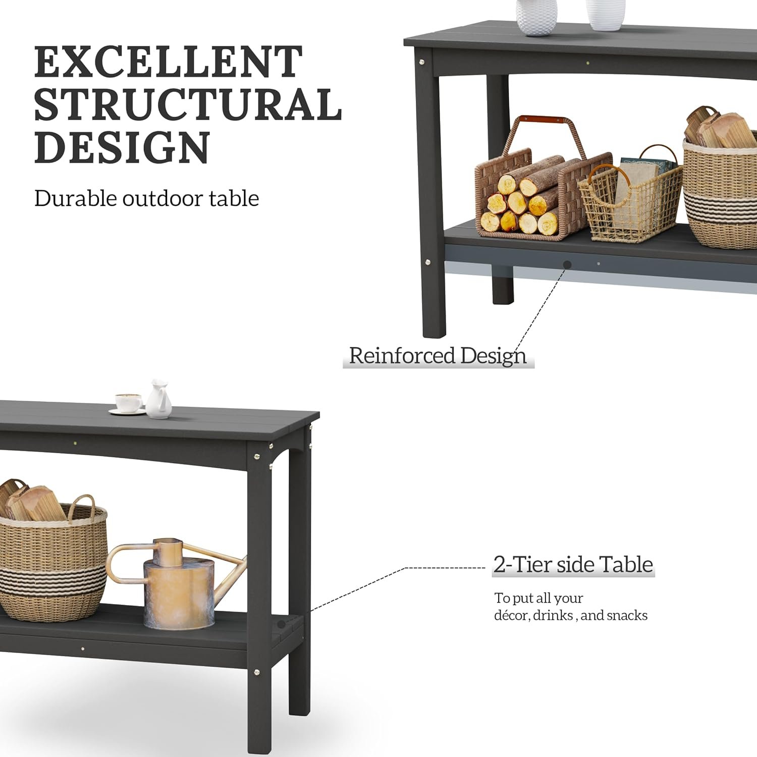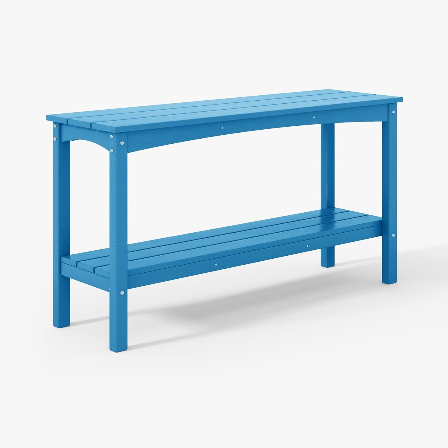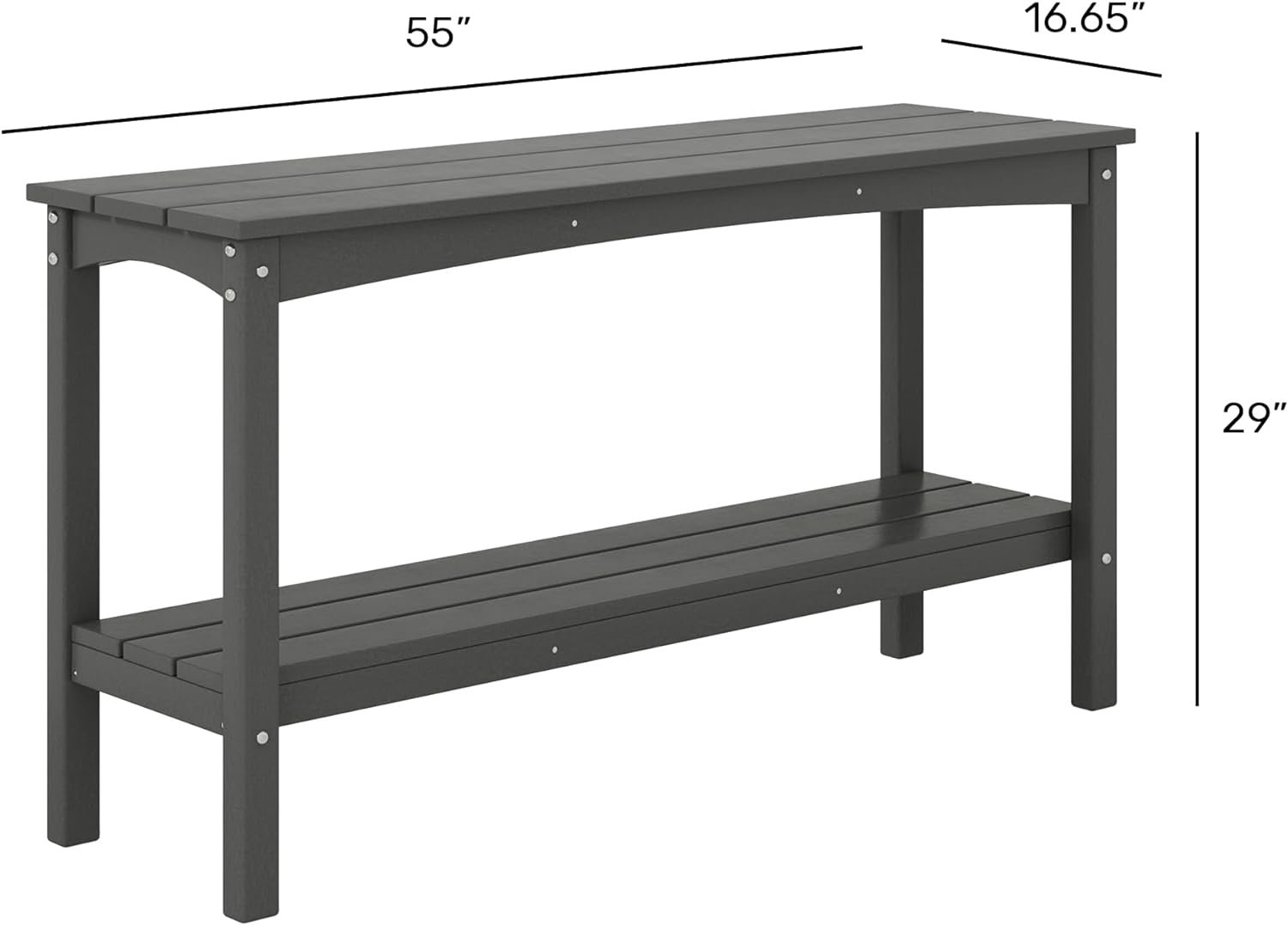 Elevate your outdoor ambiance with this resilient 2-tier console table meticulously crafted from durable HDPE materials. Engineered with reinforced legs for enhanced stability and fortified with UV and Fade Resistance, as well as Weather Resistance, it stands as an exemplary choice for your patio or backyard oasis. Beyond its functional appeal, this table embodies versatility, gracefully adorning your entryway while providing ample space for showcasing decor or accommodating beverages during al fresco gatherings. With its generous shelf storage, it effortlessly organizes hand towels and essentials, catering to both indoor and outdoor requirements.