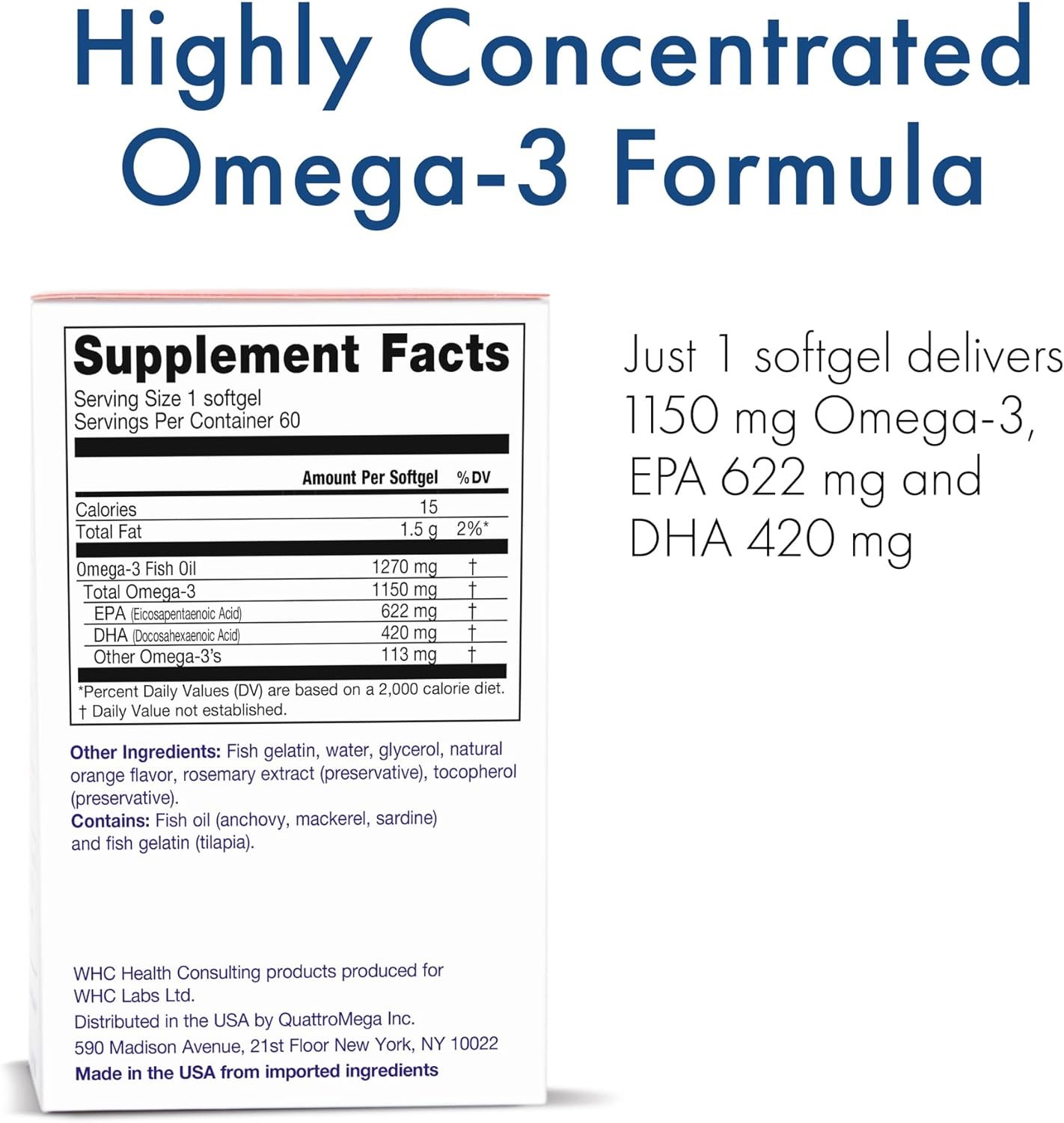 High-quality supplement delivering a powerful dose of 1150 mg omega-3 from 1270 mg fish oil; Supports healthy heart, brain, vision and immune health