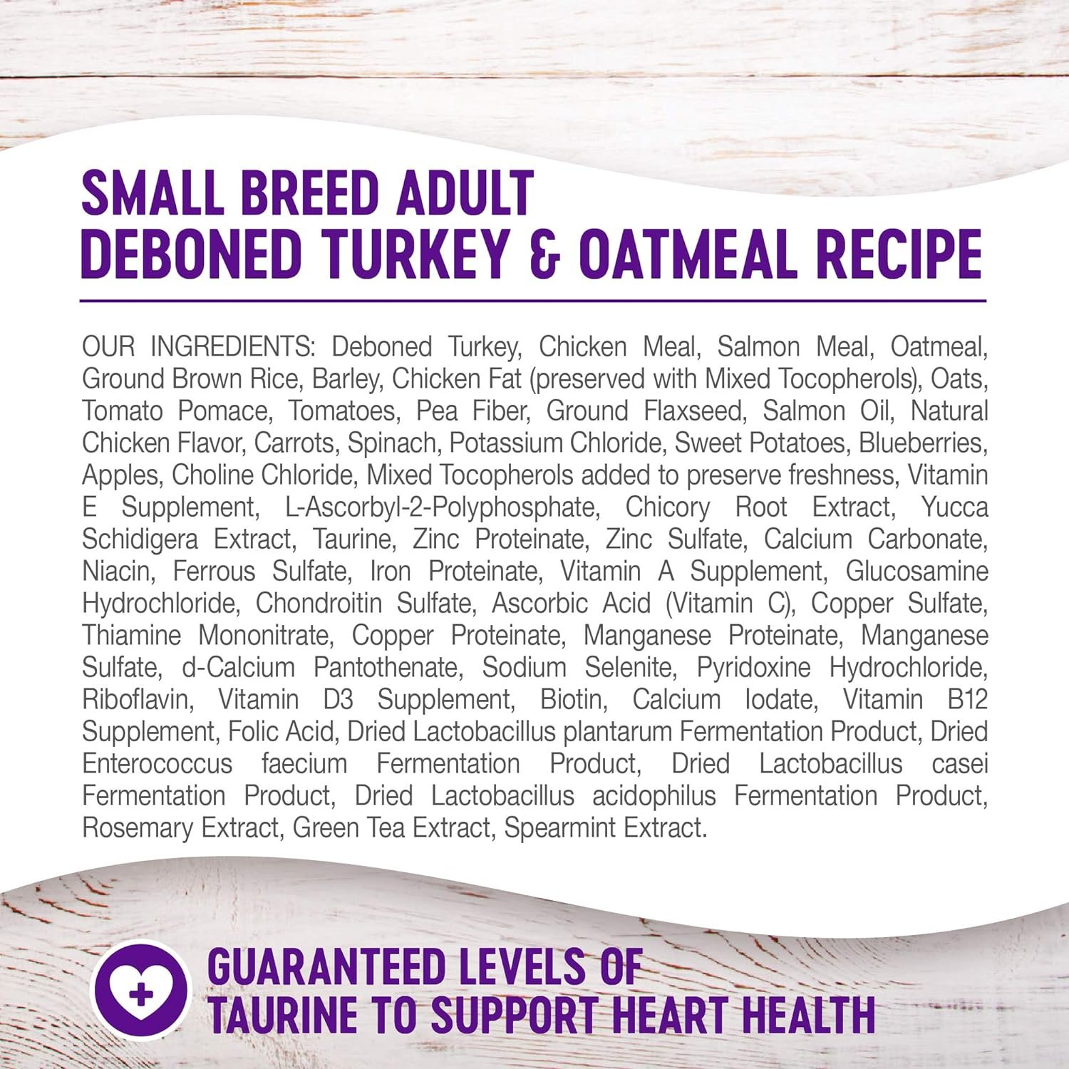 This adult small breed dry dog food’s #1 ingredient is turkey; high quality protein with wholesome grains like oatmeal