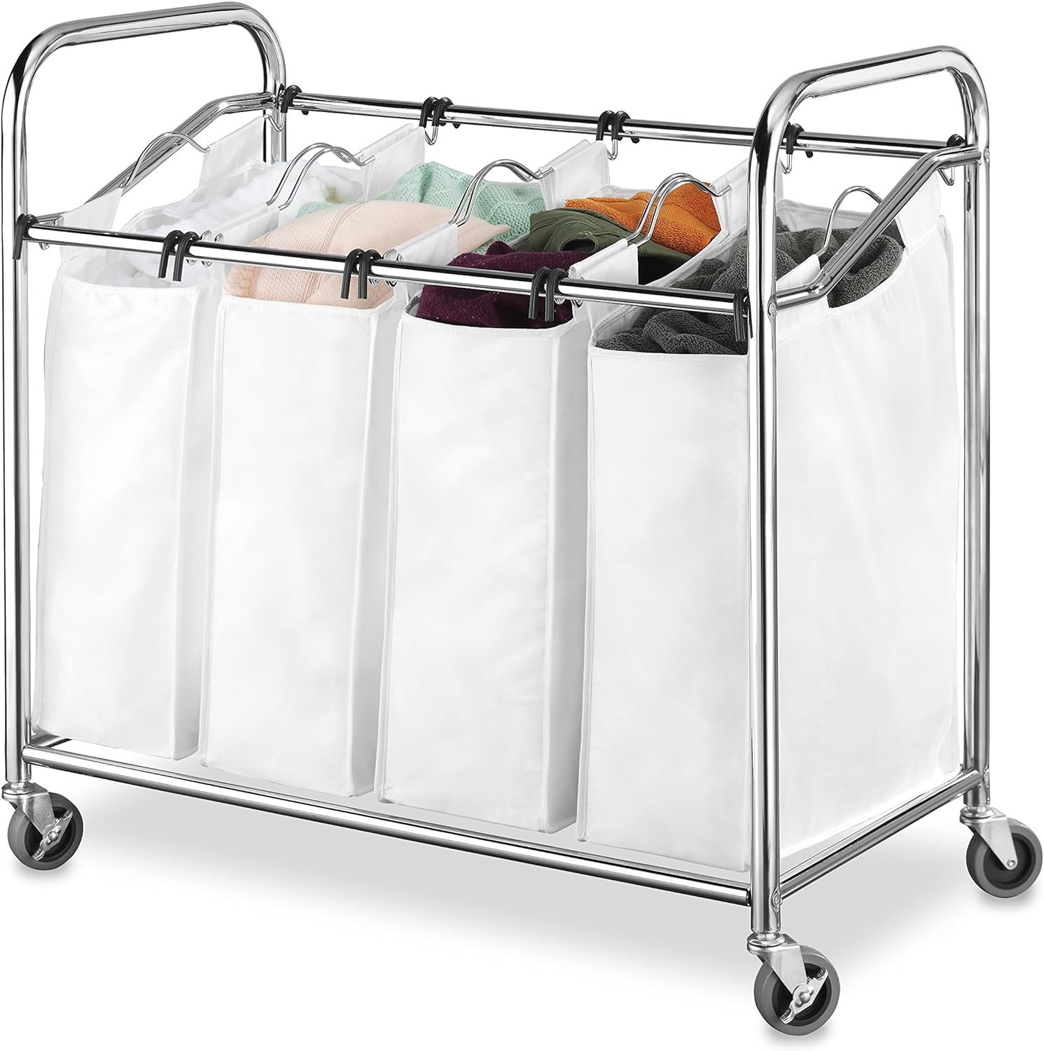 Whitmor 4 Section Laundry Sorter – Dimensions: 20″ x 36″ x 33″ – Easy assembly. 4 removable 100% cotton canvas bags with handles for easy portability. Heavy duty wheels. Durable chromed metal frame.