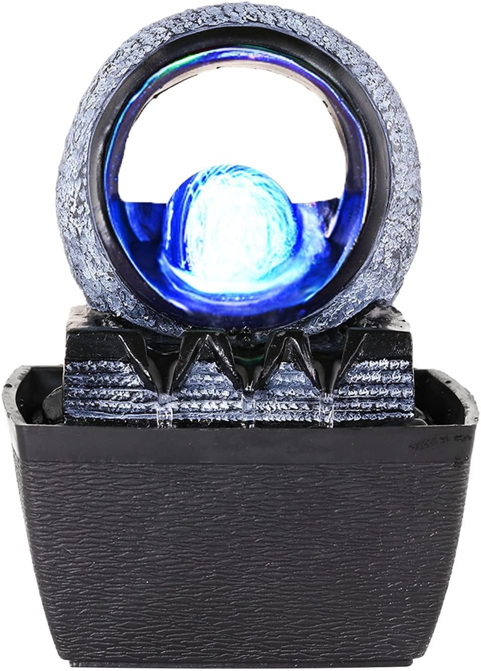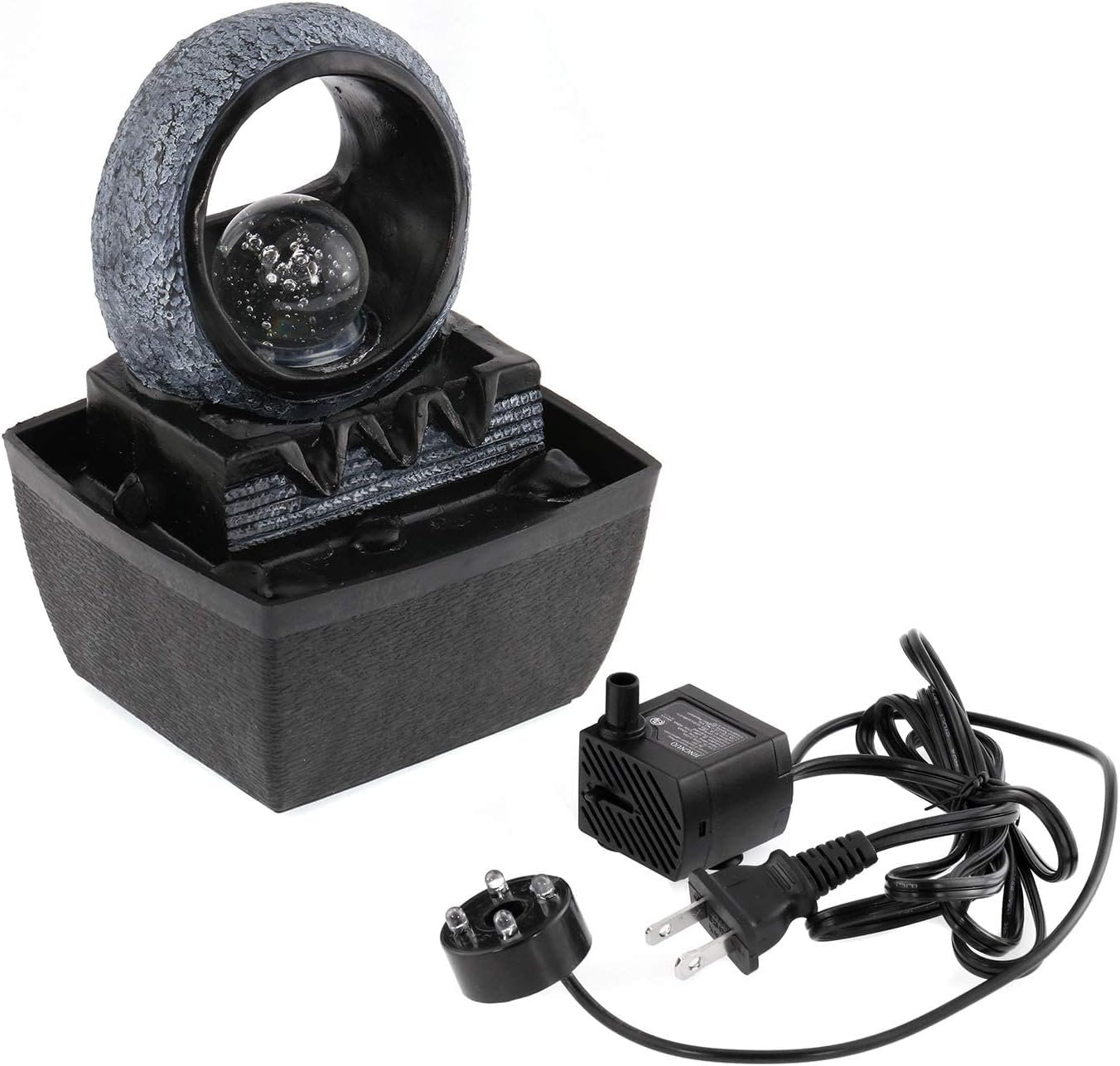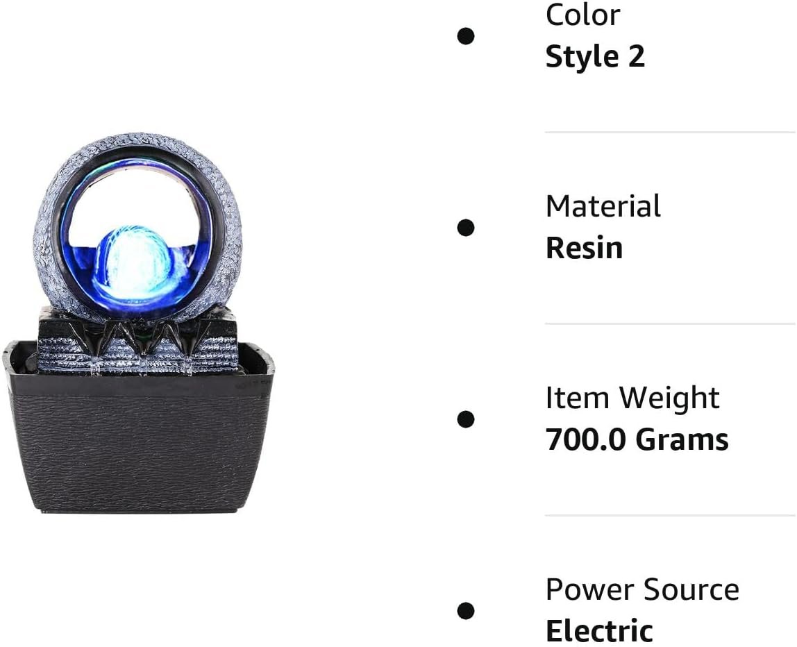 Built-in LED Light: The rolling ball of fountain is lit by the LED lighting to offer a peaceful, calming glow. Crystal-like orb spins as water cascades down water tiers of stone-like layers creating a calming ambiance. Give your home or office a touch of style and serenity with this indoor water feature.