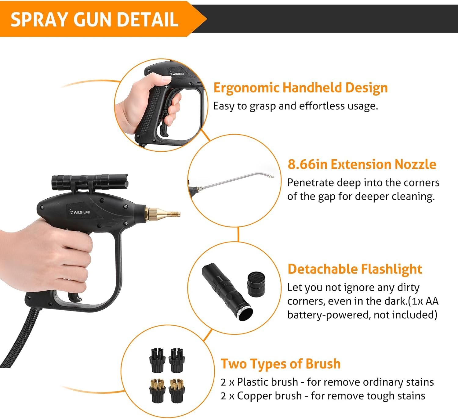 【360°Omni-directional Cleaning】The steam cleaner is equipped with 1 x Large Nozzle, 1 x Extension Nozzle, 1 x Flashlight, 2 x Plastic Brush, and 2 x Copper Brush. Our steam cleaning machine features extended 2.5m tubes that combine high-temperature steam to penetrate deep into the corners of the gap for easy cleaning. The detachable flashlight lets you not ignore any dirty corners, even in the dark.