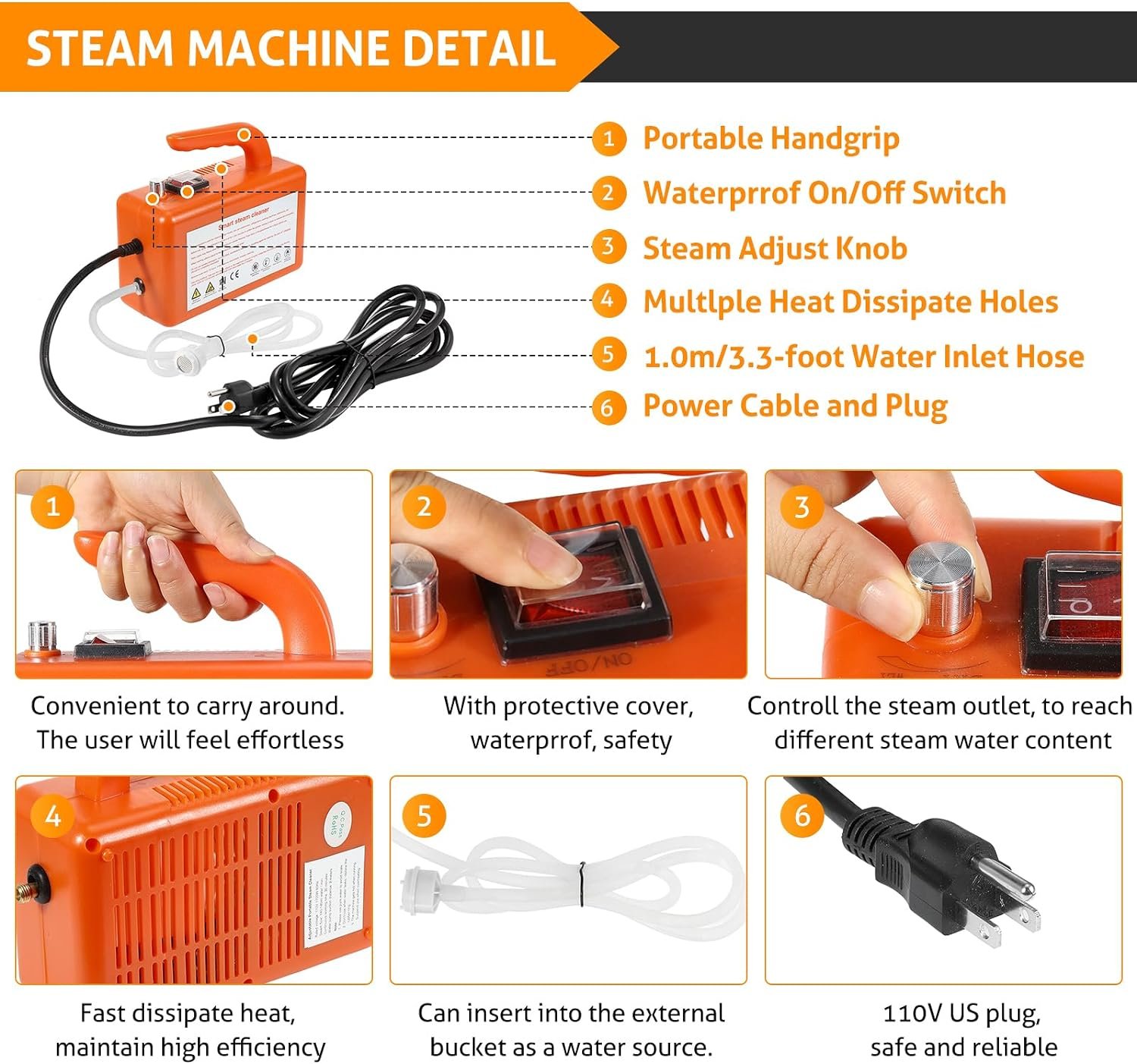 【Easy To Use】The operation is simple, ust put the tube in water, turn on the switch and hold the handle to start cleaning. There is a Knob that can controll the water inlet, to reach different steam water content. Save energy, less water.