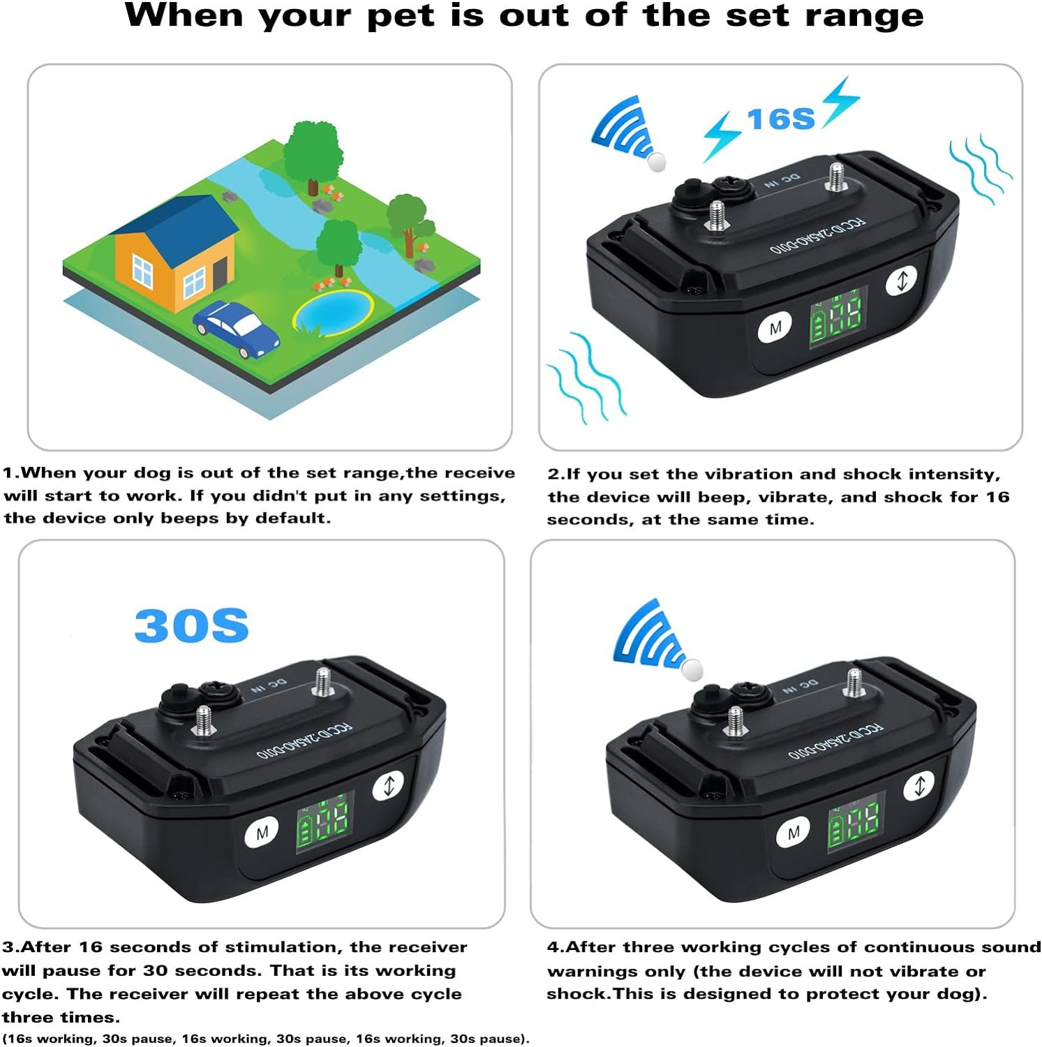 【SAFETY DESIGN】 🐶 If your dog goes beyond the set range, the vibration or electric shock will keep working non-stop for 16 seconds, followed by a 30-second pause. Then it will repeat this three times automatically. After warning three times, if your dog has still not returned to the safety area, the system will no longer work until dog comes back to the safety area. All in all, the humanized software settings can avoid any harm to your pets.