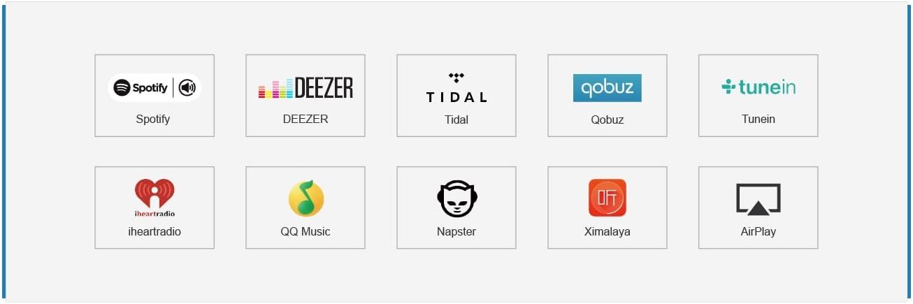 🎶Multiple Music Sources & Protocols: Supports Spotify, Tune in, iHeartRadio, XIMALAYA, QQ Music, TIDAL, Napaster, Qobuz, QQFM etc. And airplay1, Qplay, DLNA, UPnP protocols. Also Other audio sources for local music, USB flash drive, NAS and line inputs.
