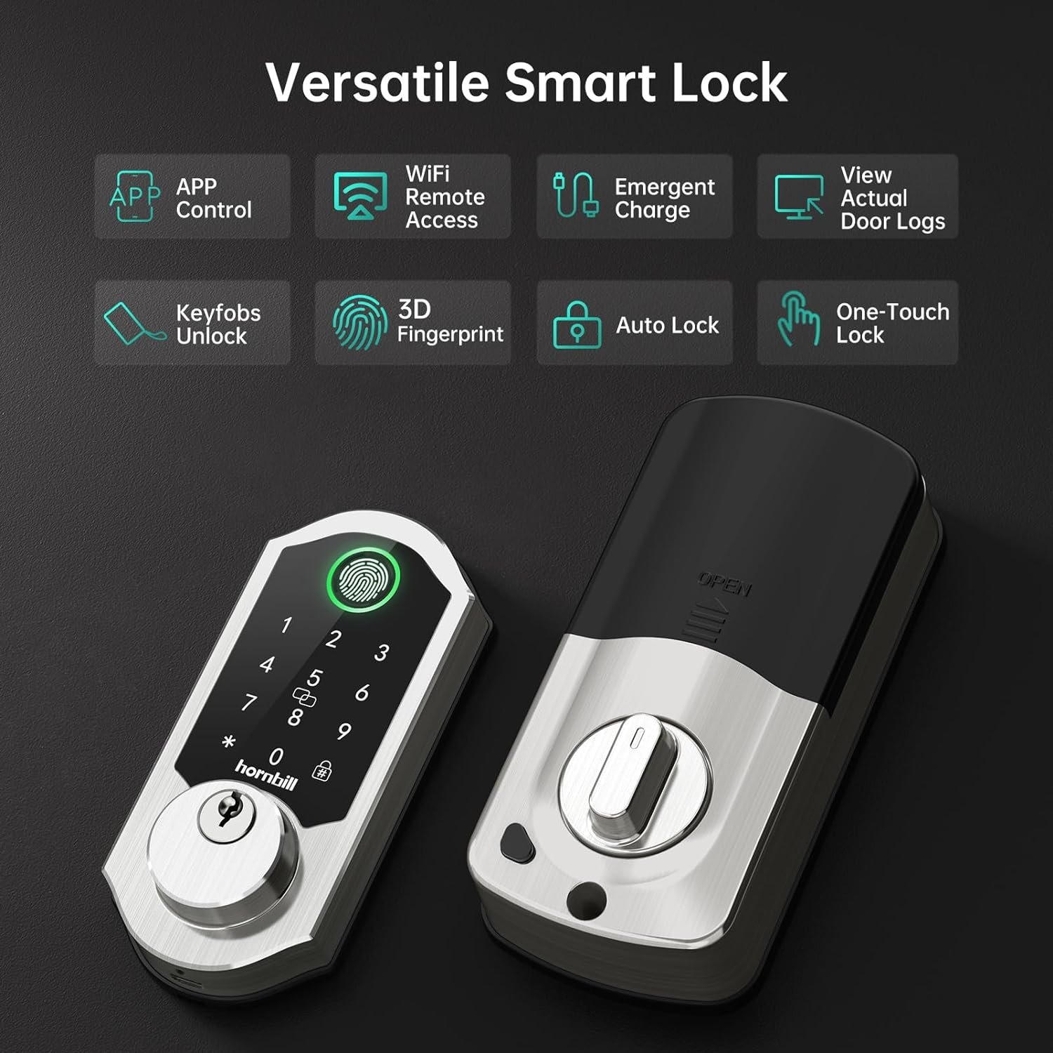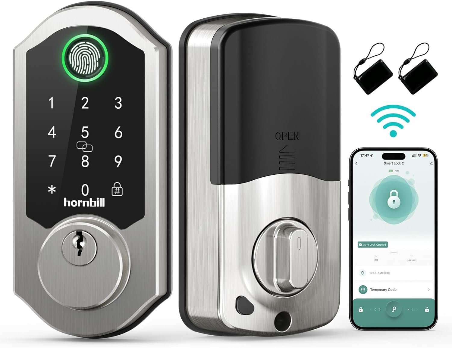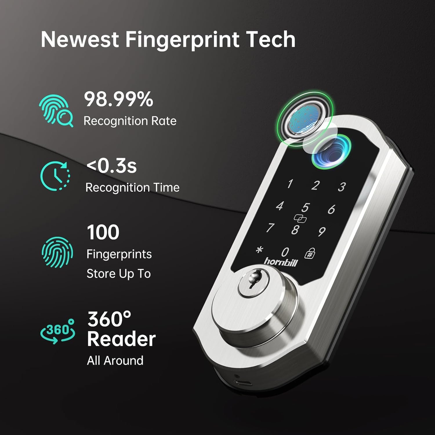 WiFi Deadbolt Smart Door Lock: Hornbill Keyless Entry Smart Lock, Alexa Fingerprint Keypad Lock, Bluetooth Electronic Deadbolt for Front Door, App Remote Control, Auto Lock/Keyfobs/Keys,Satin Nickel