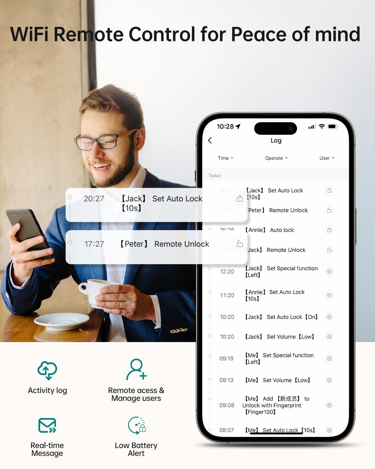 WiFi App Remote Control: With the included gateway, you can effortlessly use the app for Remote Access, easily Share eKeys, Manage users, View all lock activity, Receive real-time message push notifications, Remotely manage passwords, and even check the real-time battery level. Stay in control of your home security with just a few taps on your smartphone. Elevate your smart home experience today!