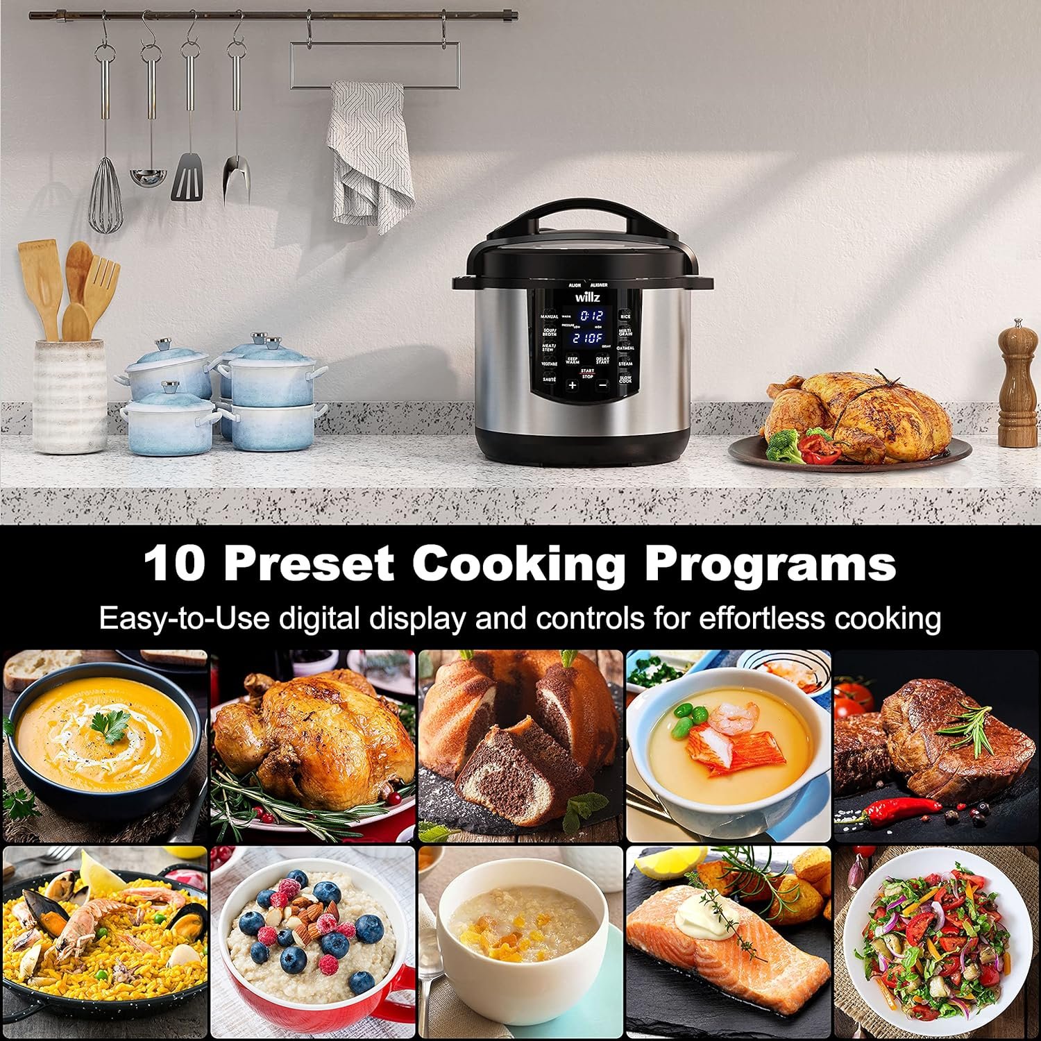 EASY ONE TOUCH COOKING – Offers 10 pre-set 1-touch programs for cooking soup/broth, meat/stew, vegetables, rice, multi-grains, oatmeal, sauté, steam, slow cook, & manual cooking.