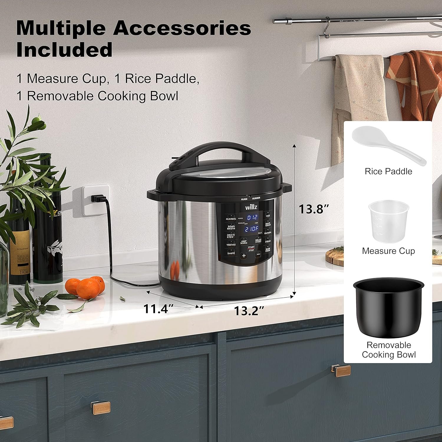 PERFECTLY SIZED & EASY TO CLEAN – Pressure cooker measures 13.75″ H x 11.4″ L x 13.25″ W, perfectly sized for small apartments and kitchens – includes a 6 Qt removable cooking bowl, rice paddle, and measuring cup.