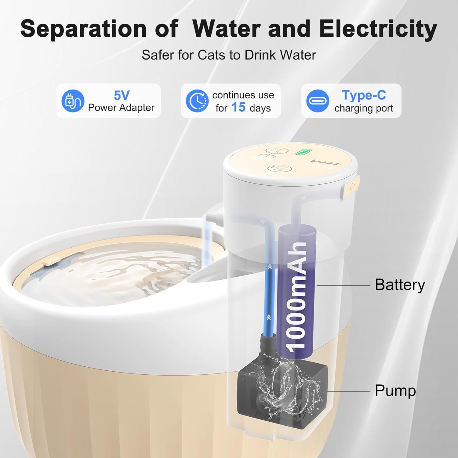Cordless Cat Water Fountain: Wireless cat water fountain no more being tied to wires, allowing you really to enjoy the convenience of wireless. Our battery operated cat water fountain can be placed anywhere when fully charged, whether it’s the living room, kitchen, cat carrier, outdoor, cats can drink water anytime and anywhere.