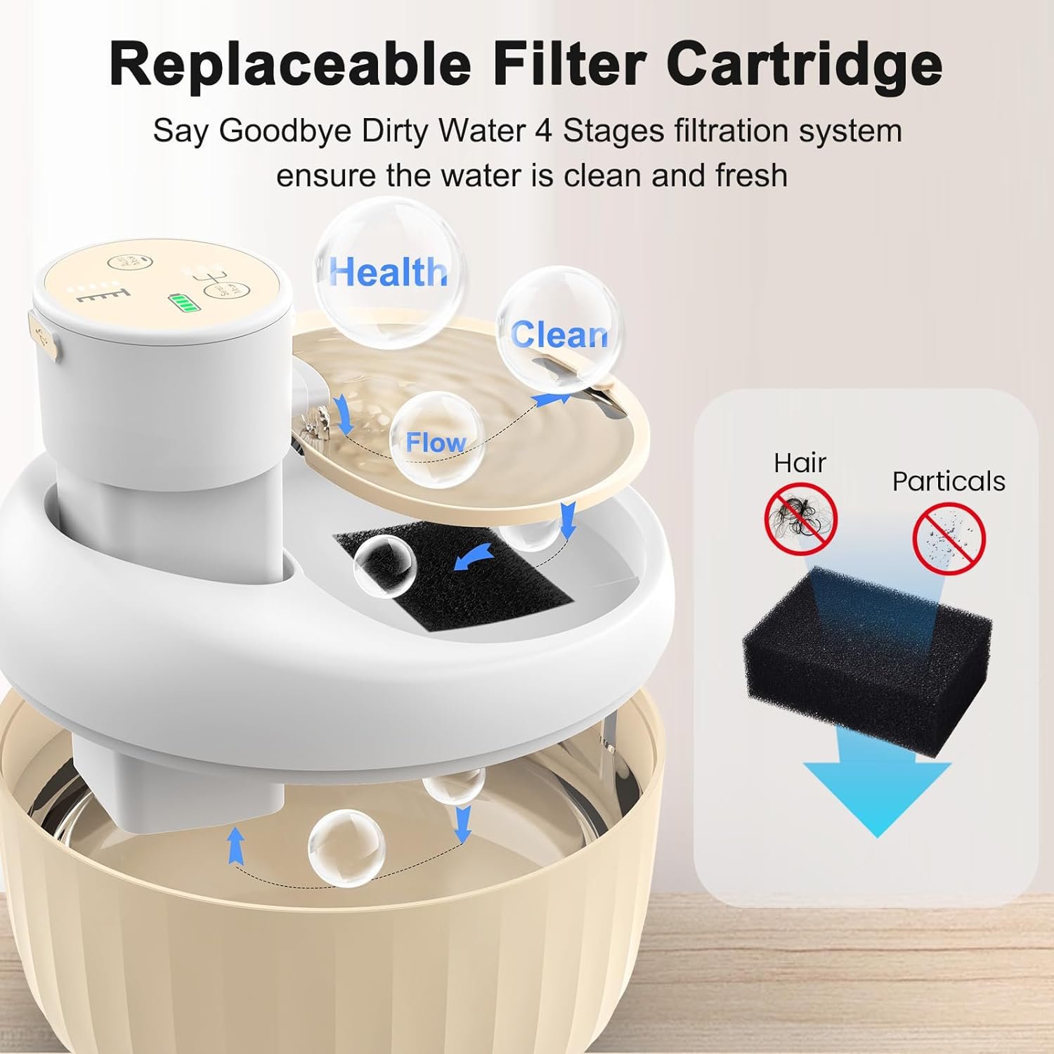 Replaceable Filter: battery operated cat water fountain equipped with a sponge filter that intercepts hair and fine debris, filters out other contaminants, and provides your cat with clean, fresh drinking water.