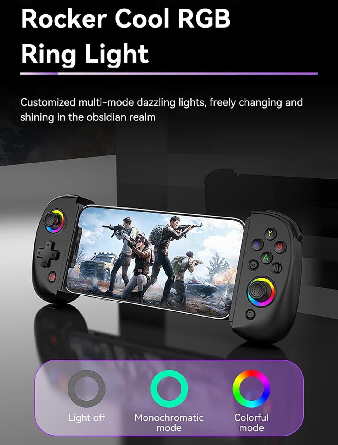 📱🎮RGB MAGIC LIGHTS & TURBO FUNCTION – The android joystick with 7 colors of RGB lights at the left and right joysticks, which look cool at night or in the dark. Turbo can be set to automatic mode, this allows you to relax your fingers during shooting games without having to worry about pressing buttons all the time.