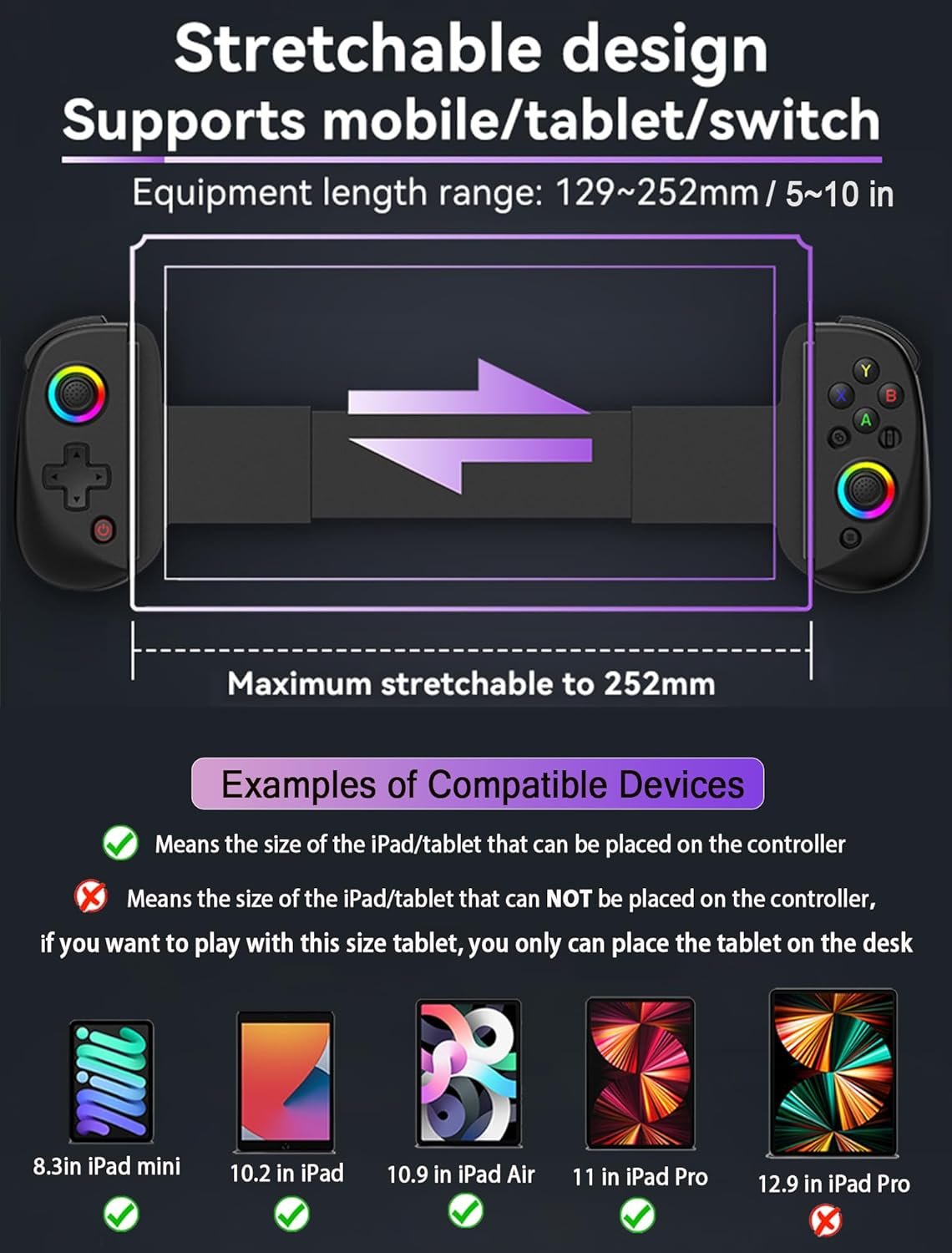 📱🎮IPAD/TABLET GAME CONTROLLER – Koiiko wireless gamepad compatible with iPad, Android tablet, compatible device size from 5-10inch, supports iPad Pro 11 inch 4/3/2, iPad air 5/4/3, iPad 10/9/8, iPad mini 6/5/4, Galaxy Tab S9 FE/S9/S8, Galaxy Tab A9+/A8, Lenovo Legion Y700 etc.. [NOTE: 𝐍𝐎𝐓 𝐟𝐨𝐫 iPad Pro 12.9inch/Galaxy Tab S 12-15inch tablet/Lenovo Legion Y900]