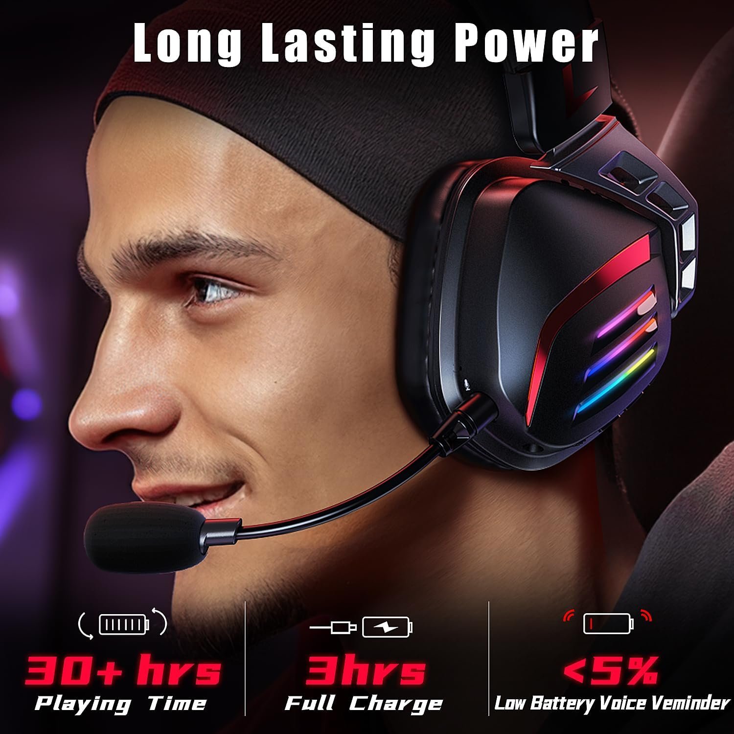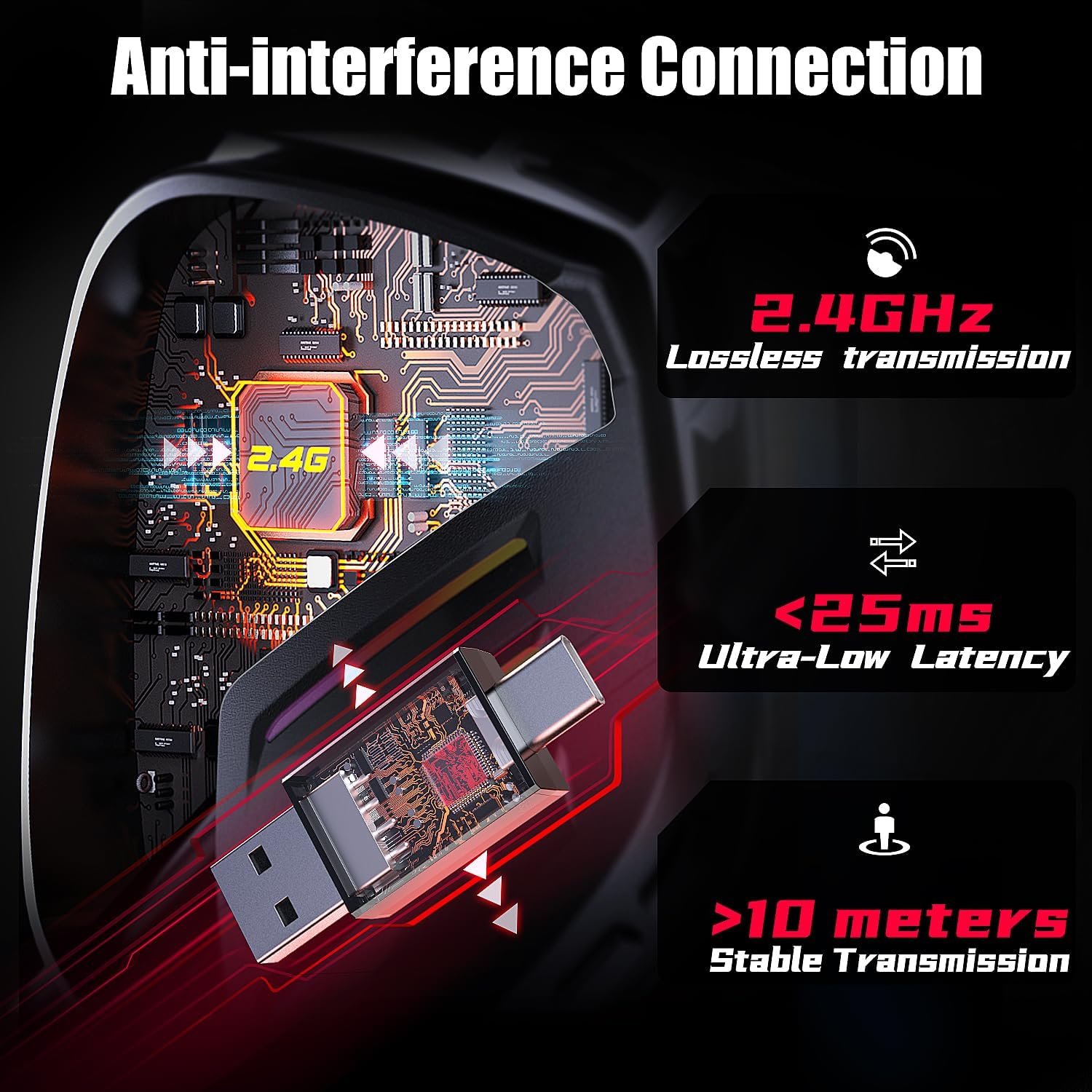 🎧【Synchronized Gaming Impact】All‑new 2.4Ghz delivers up to two times lower latency speeds than bluetooth, anti-interference stable transmission advantage ensures the high speed of audio signal transmission, audio and video ynchronization. Gaming actions and sound effects are perfectly integrated, wear wireless gaming headset, allowing you to truly experience the impact of every game.