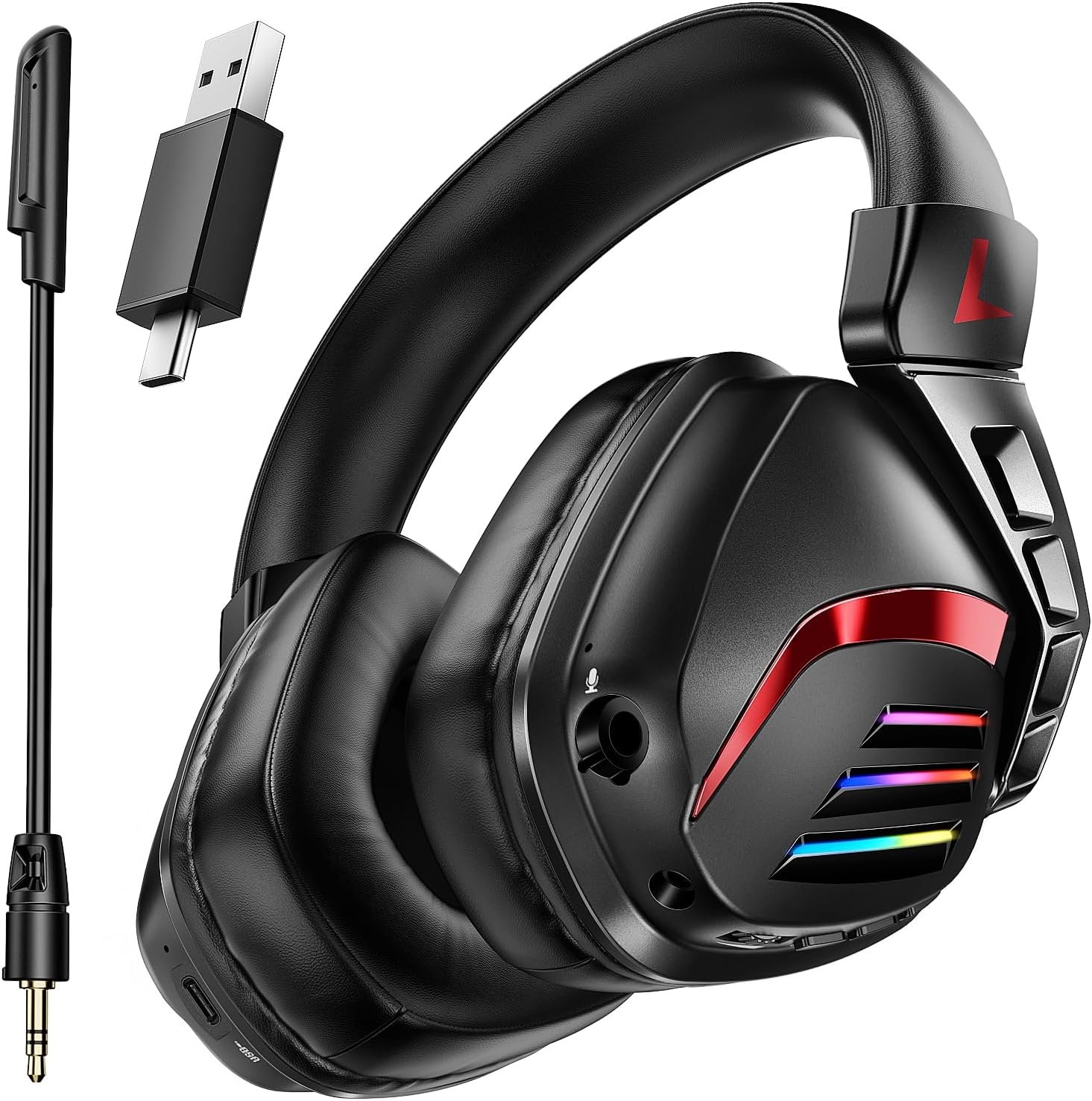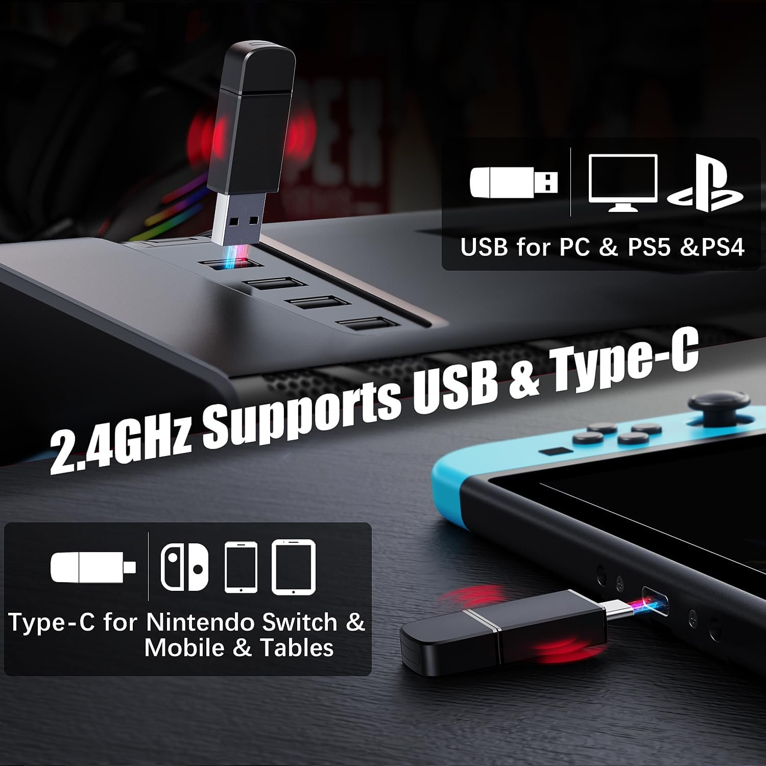 🎧【Wide Compatibility, Wireless Freedom】The USB+Type-C dual-head dongle of gaming headset wireless is compatible with multiple gaming devices: USB for PS4/PS5/PC, Type-C for Switch/phone/tablet. With the 2.4GHz wireless technology, you can completely get rid of tangled cables and fully enjoy the joy of gaming. Connecting with a 3.5mm audio cable can switch to wired headset.
