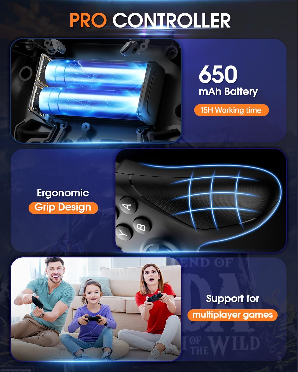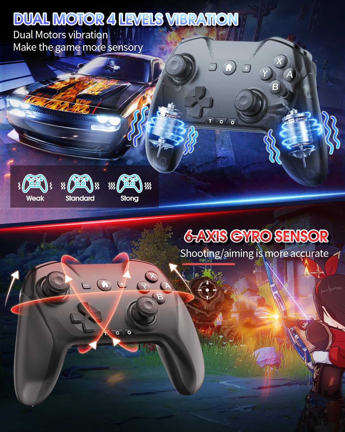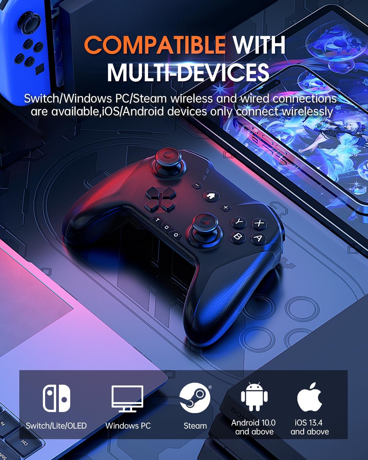 [Strong Compatibility] The switch pro controllers not only compatible with Switch Console(Switch/Lite/OLED) , but also is available for iOS/Android/PC/Steam/Laptop/Phone/Table/TV. You can connect game controler though Bluetooth or wired two modes. Gaming controller supports wireless connection to play switch games, iOS Apple Arcade MFI games(IOS 13.0 and above), Android games; also can be via USB wired connection with PC(Windows 7 and above) to support playing X-Input and most cloud games like