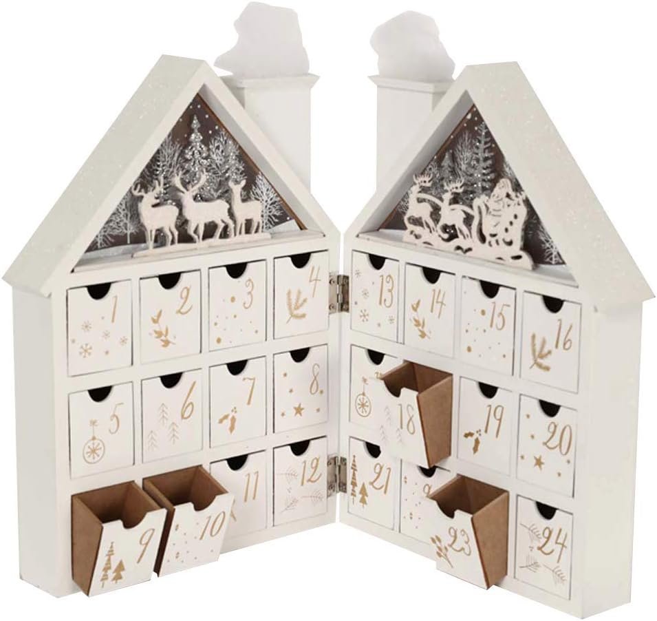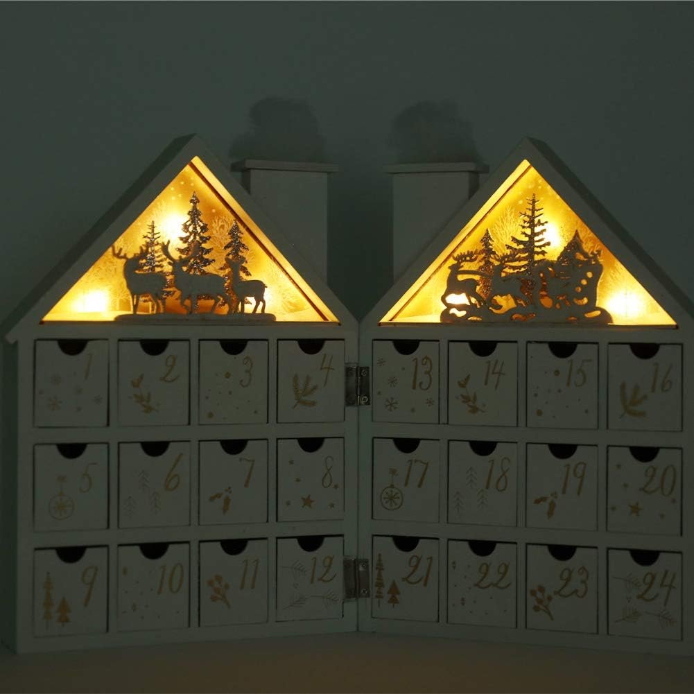 🎅[Size (Opened House)]: Width 16.5” x Height 11.8” x Thickness 1.65”.Drawers size approx: 1.5” x 1.3” x 1.9”. The Christmas wooden advent calendar house Requires 4 x AAA batteries (Not included).