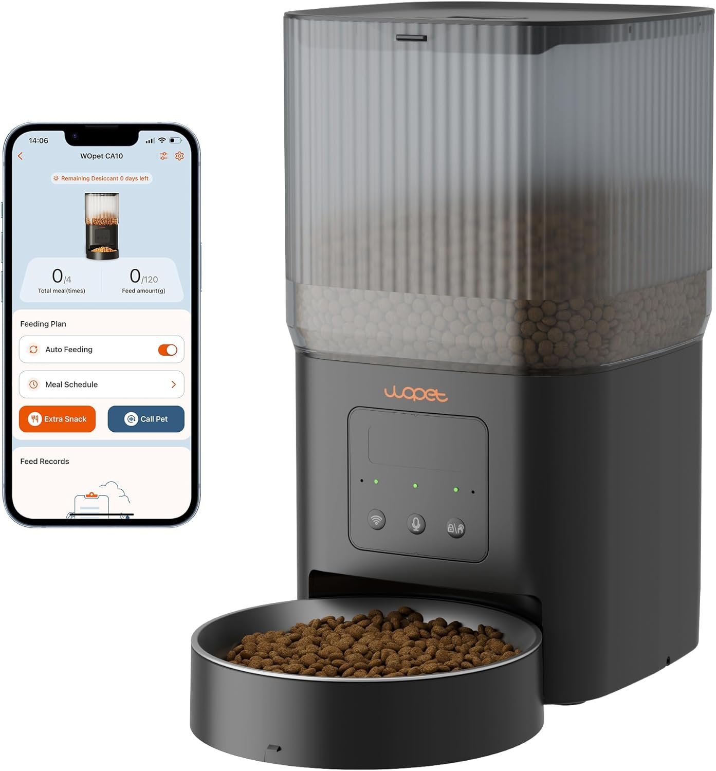 WOPET wifi cat feeder is made to dispense dry food from a storage compartment that keeps kibble from going stale, and it can effortlessly dispense food with a maximum kibble size of 12mm.
