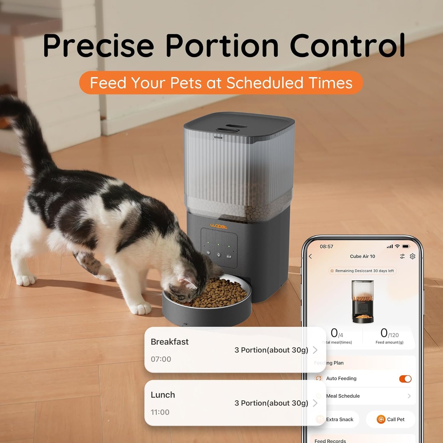 🐕【Easy to Set – 10 Grams per Portion, 1-8 Portions per Meal, 1-6 Meals per Day】WOpet Automatic Cat Feeder Connect effortlessly to your 2.4GHz network and take charge of your pet’s feeding routine with your phone. You can set up to 6 meals per day with 1-8 portions per meal and track the feeding logs easily by using the “WOpet Life” APP,give different age groups of different pets the best health feeding!