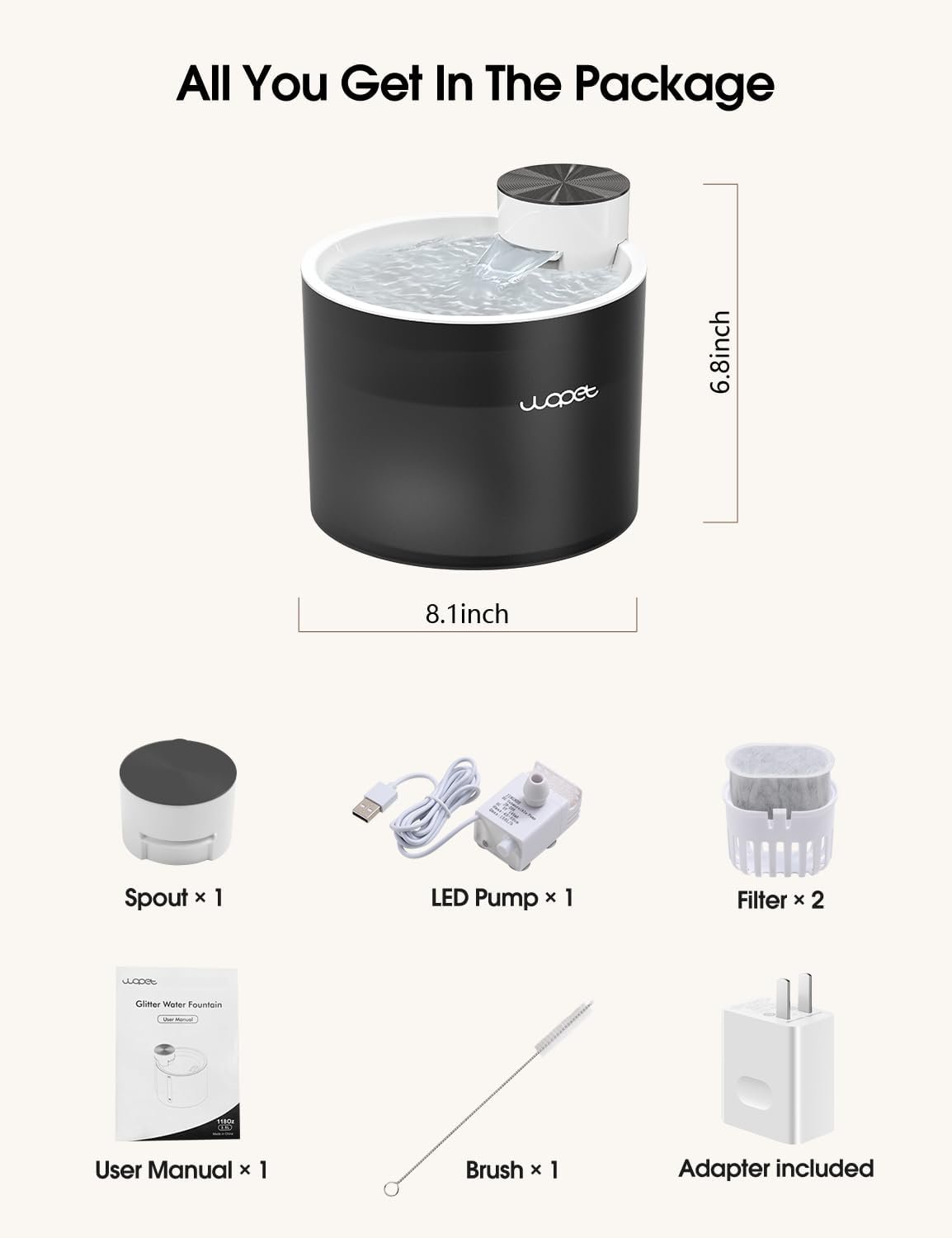【Easy to Set Up and Clean】 WOPET cat water dispenser is easy to assemble and disassemble for cleaning and replacement. For your pet’s health, it’s recommended to change the filter every week! Make sure the filter is soaked for 5 minutes before use! Note: the pet fountain doesn’t come with a wall plug. It is recommended to use a 5V, 1A adapter or power bank to operate