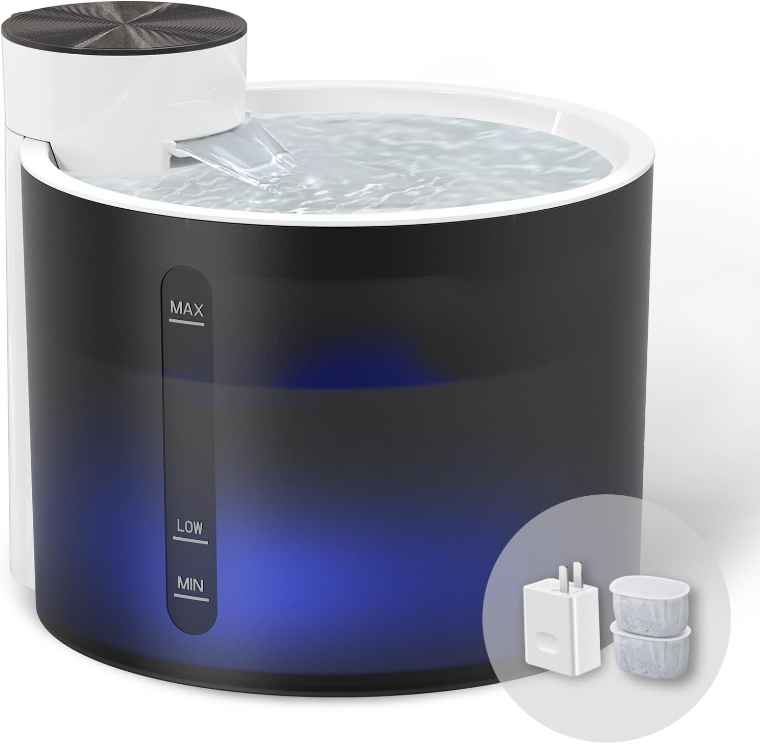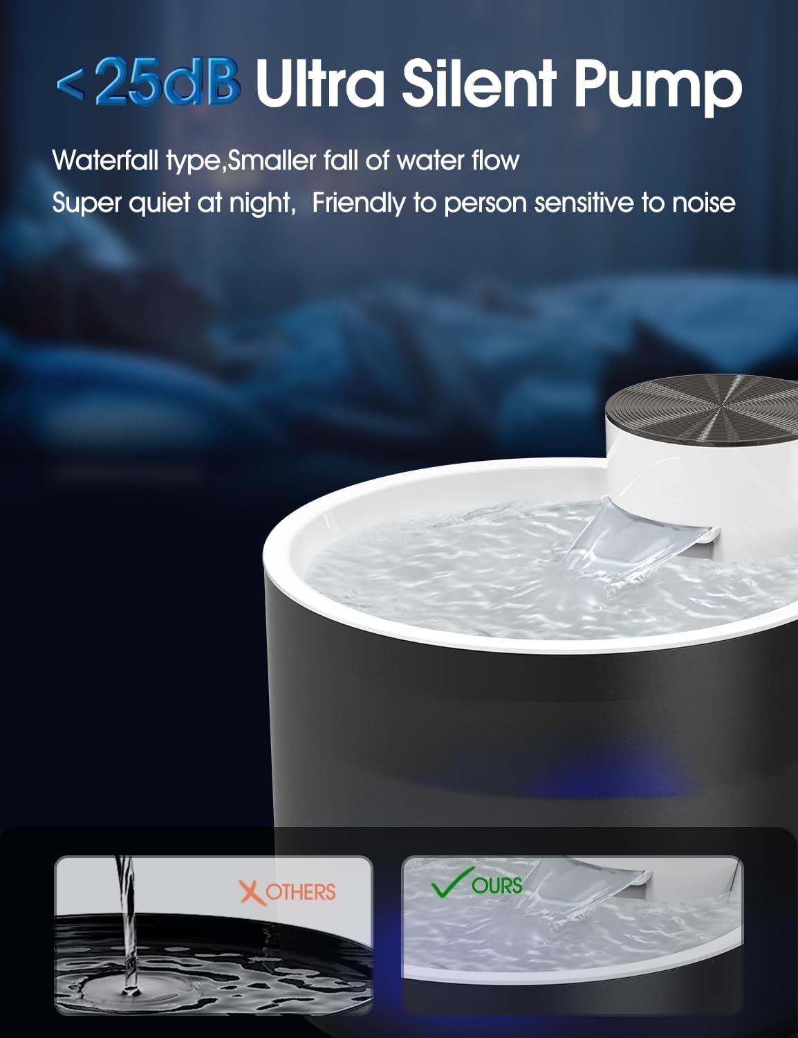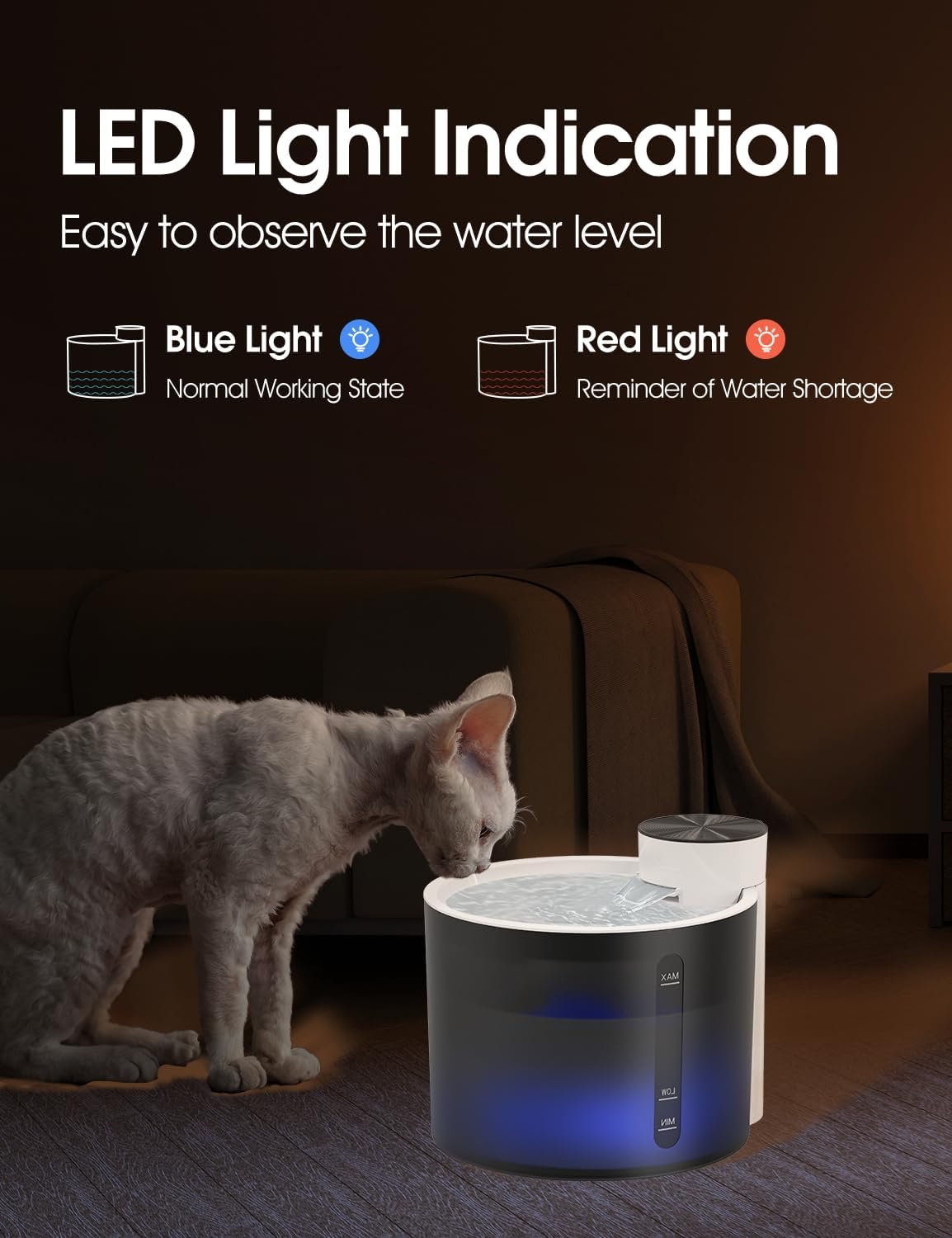 【Cat Fountain with Smart Pump】 The ultra silent water pump comes with LED light and water level sensor that will add a lovely glow in your home and lack water reminder. The red light is displayed to remind you to refill water to prevent it from running dry and overheating. Your cat can easily find the cat fountain in the dark.
