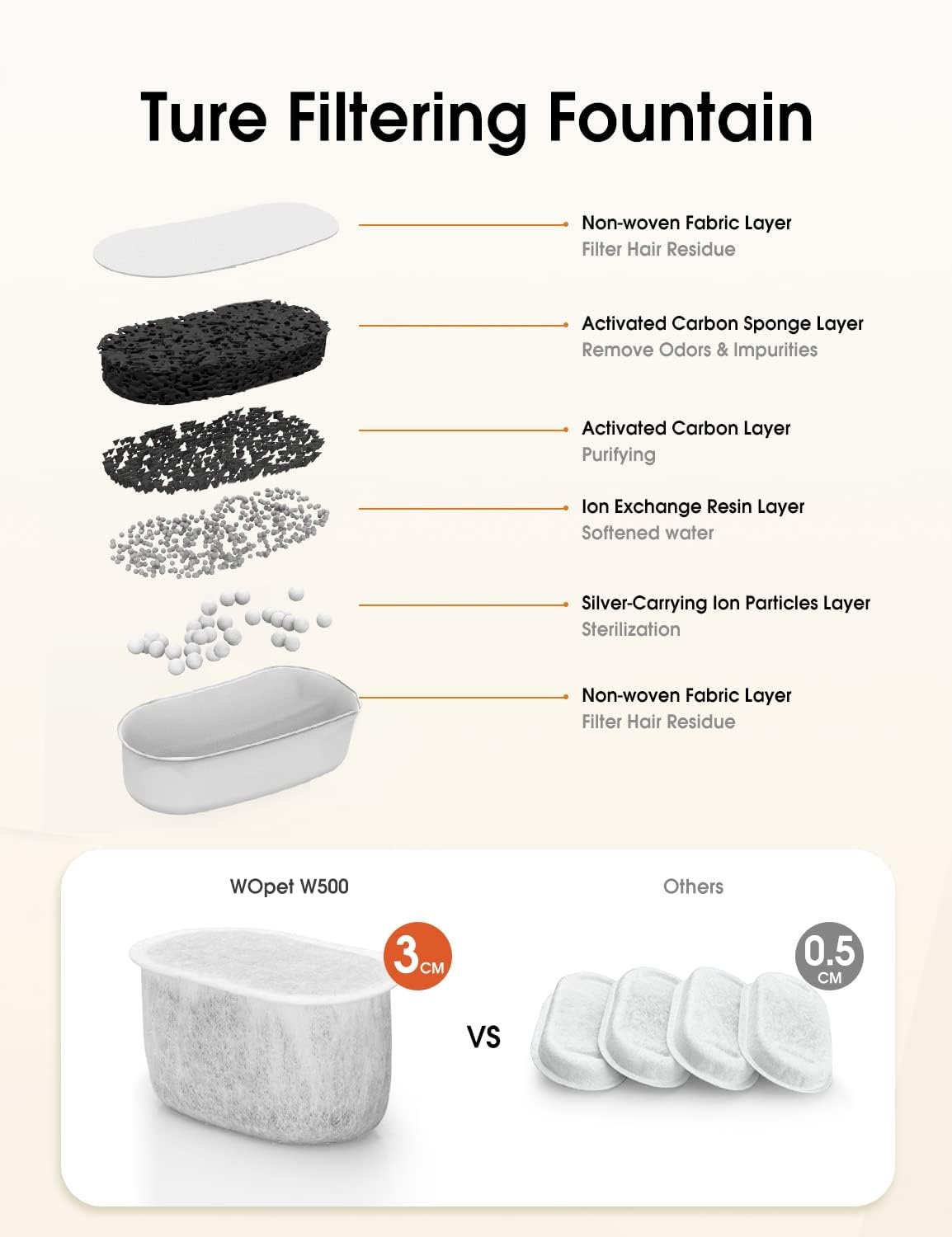 【True Filtering Fountain】W500 with Wopet true filtering technology for 6 layers filtration, the filter height reaches 3cm, which includes an activated carbon layer, an ion exchange resin layer, one activated carbon sponge layer, one silver-carrying ion particles layer and two thick non-woven fabric layer, making water better tasting and safer for your lovely pets.