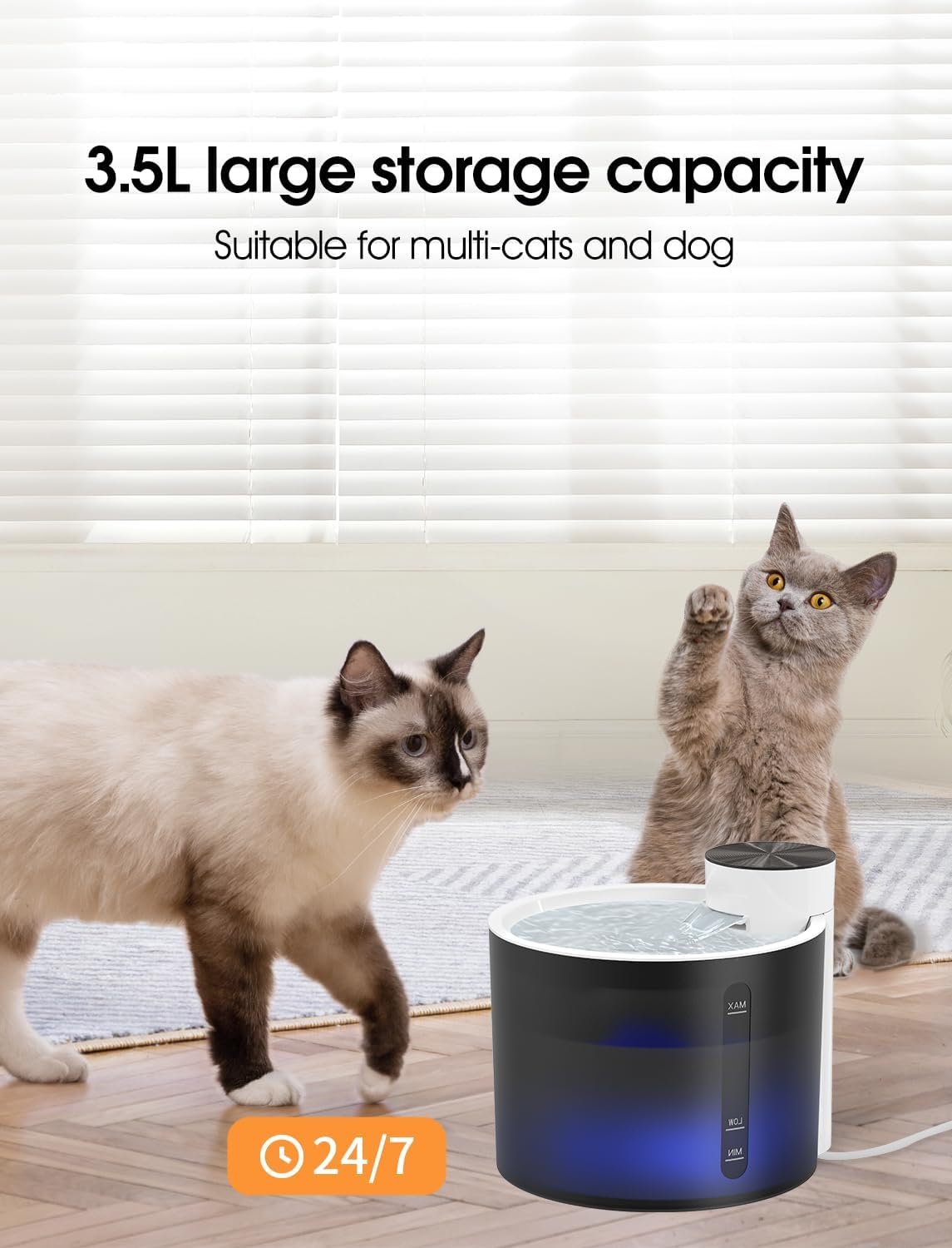 【118oz Large Capacity Dog Fountain】1GAL / 118oz water capacity is great for small to medium-sized pets.It can last up to 7 days when filled with water. It does not require frequent refilling.Water automatically flowing could attract and encourage pets to drink more water.