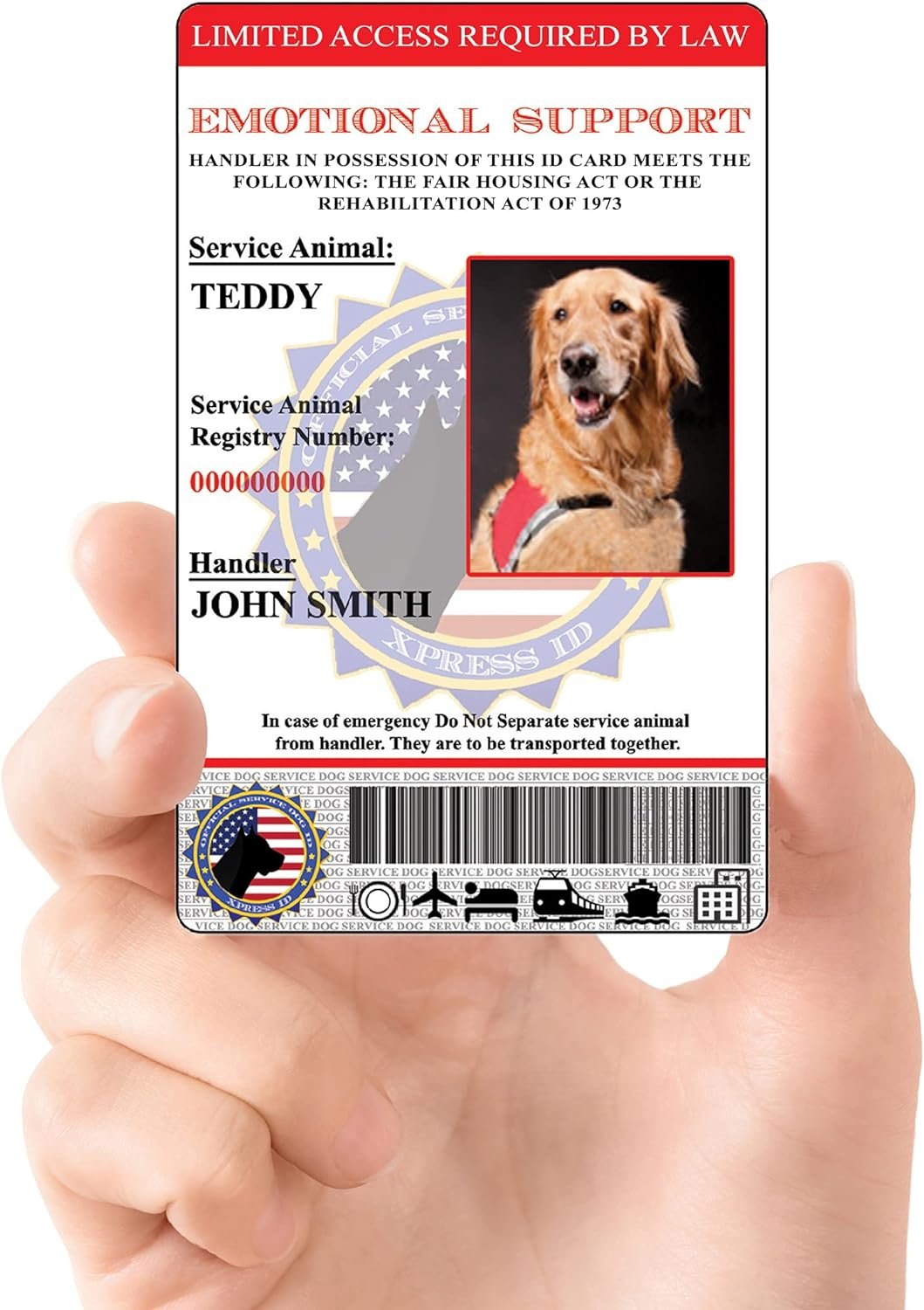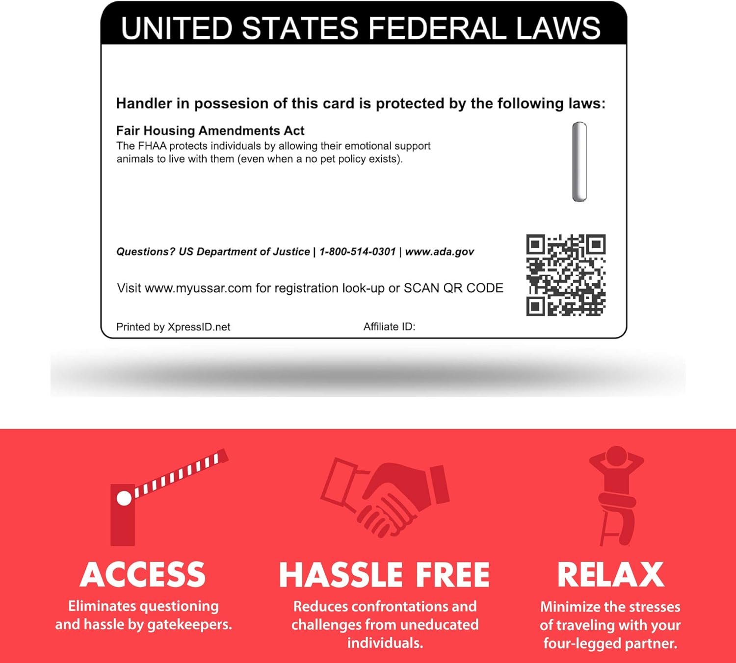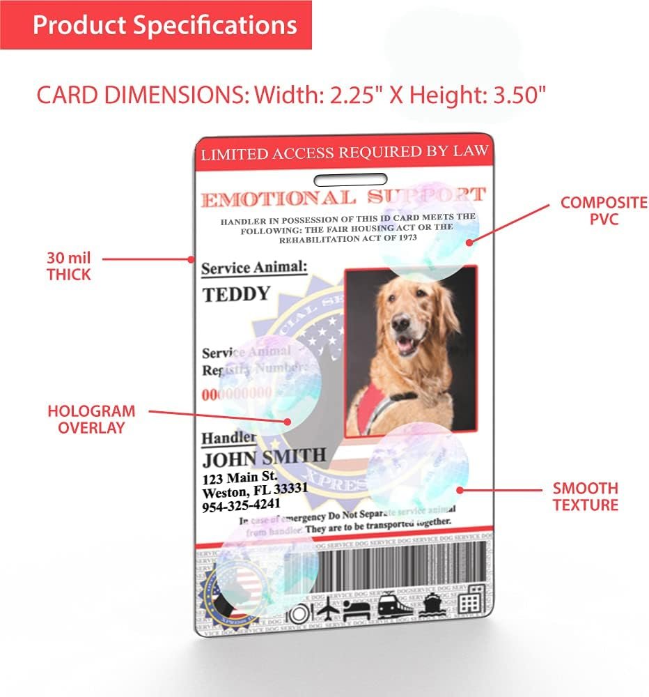 REGISTRATION to the U.S. Service Animal Registry with your purchase. Registration is done simultaneously as you enter your dog and handler information on our online form. QR CODE READY: A unique QR code is printed on the rear side of the PVC card, when scanned it will redirect to the handler and dog’s profile page on our registry site.