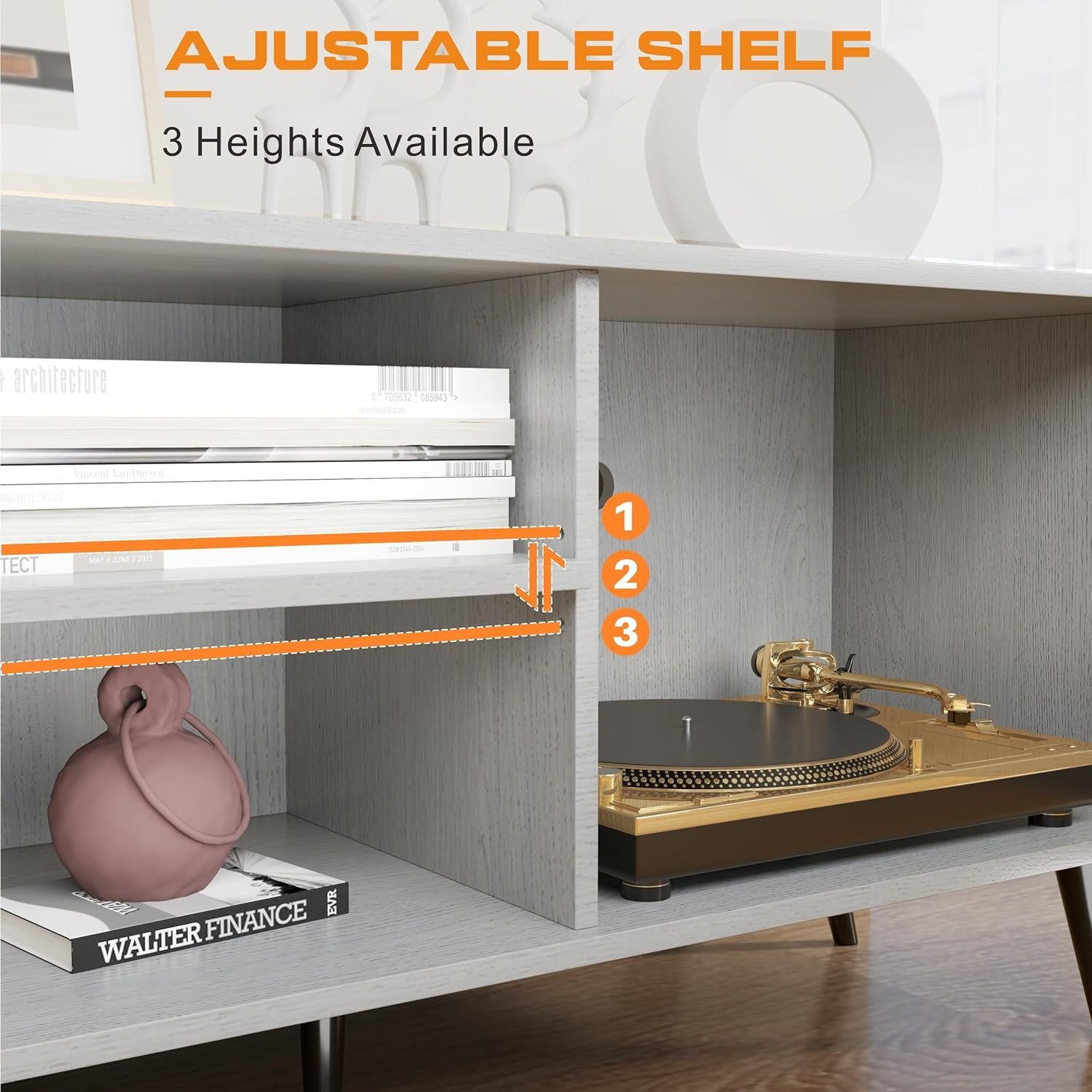 【Adjustable Shelf】The top surface of this entertainment center can hold up to 110 pounds. The center shelf is adjustable ±1.5” to meet your storage needs and can hold up to 55 pounds