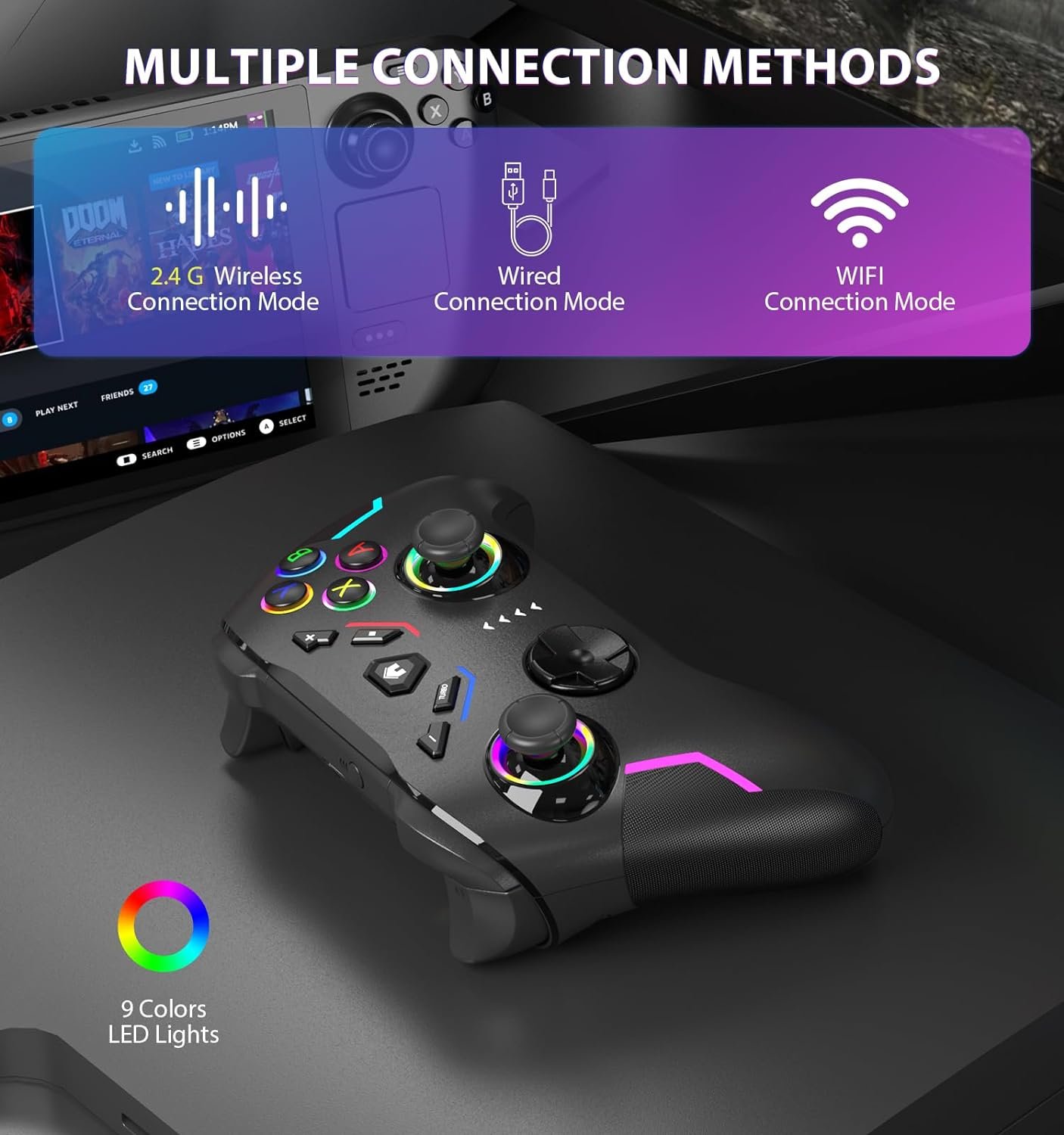 【Connectivity Mode】Our wireless PC gaming controller has 2.4G wireless connection mode, WIFI connection mode and USB-C wired connection mode; the main 2.4G wireless connection mode can be connected at a long distance, and you no longer have to worry about being limited by the distance.