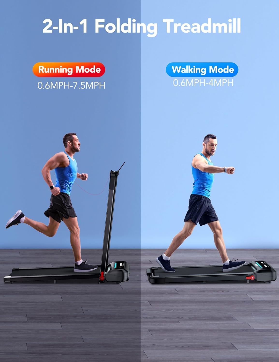 【2 in-1 Folding Treadmills】: No assembly required and can be used right out of the box; when the upright column is folded, it can be used as a jogging machine with remote control (0.6MPH-2.5MPH), and be used as a running machine when it’s unfolded (0.6MPH-7.5MPH)