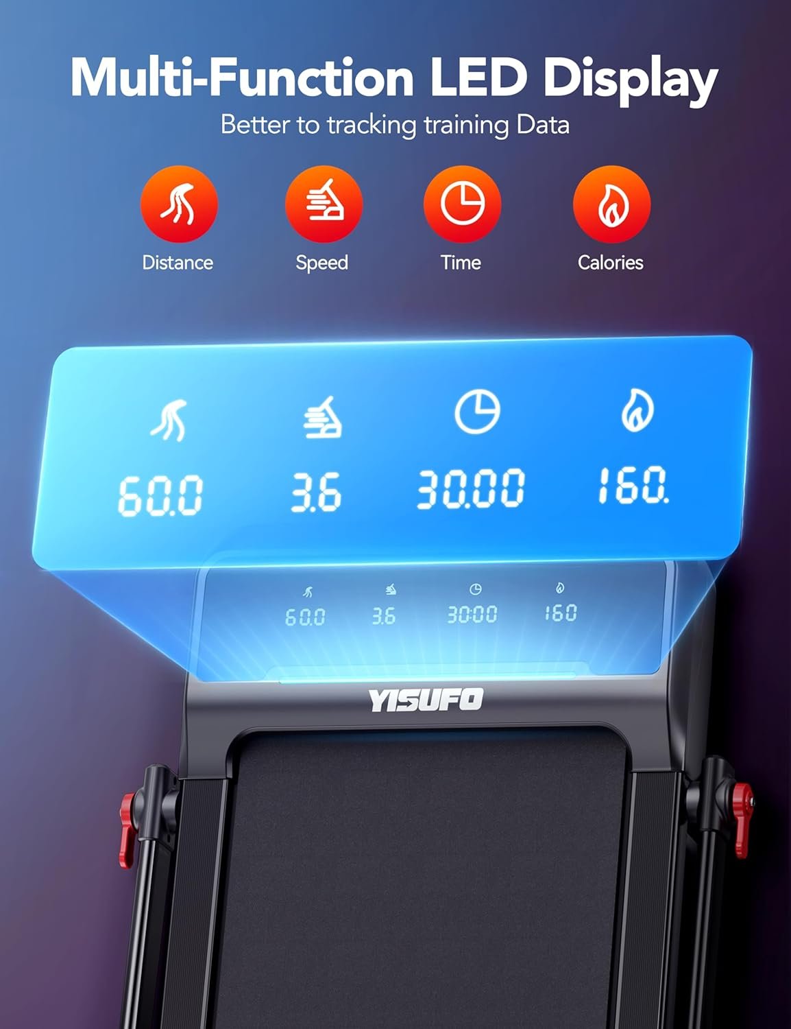 【Larger LED Screen / High-definition LED Display】: Compared with the competition (only 1 or 2 LED display), the YISUFO treadmill has 4 built-in LED displays in the head position, allowing you to track time, speed, distance, and calorie data at a glance
